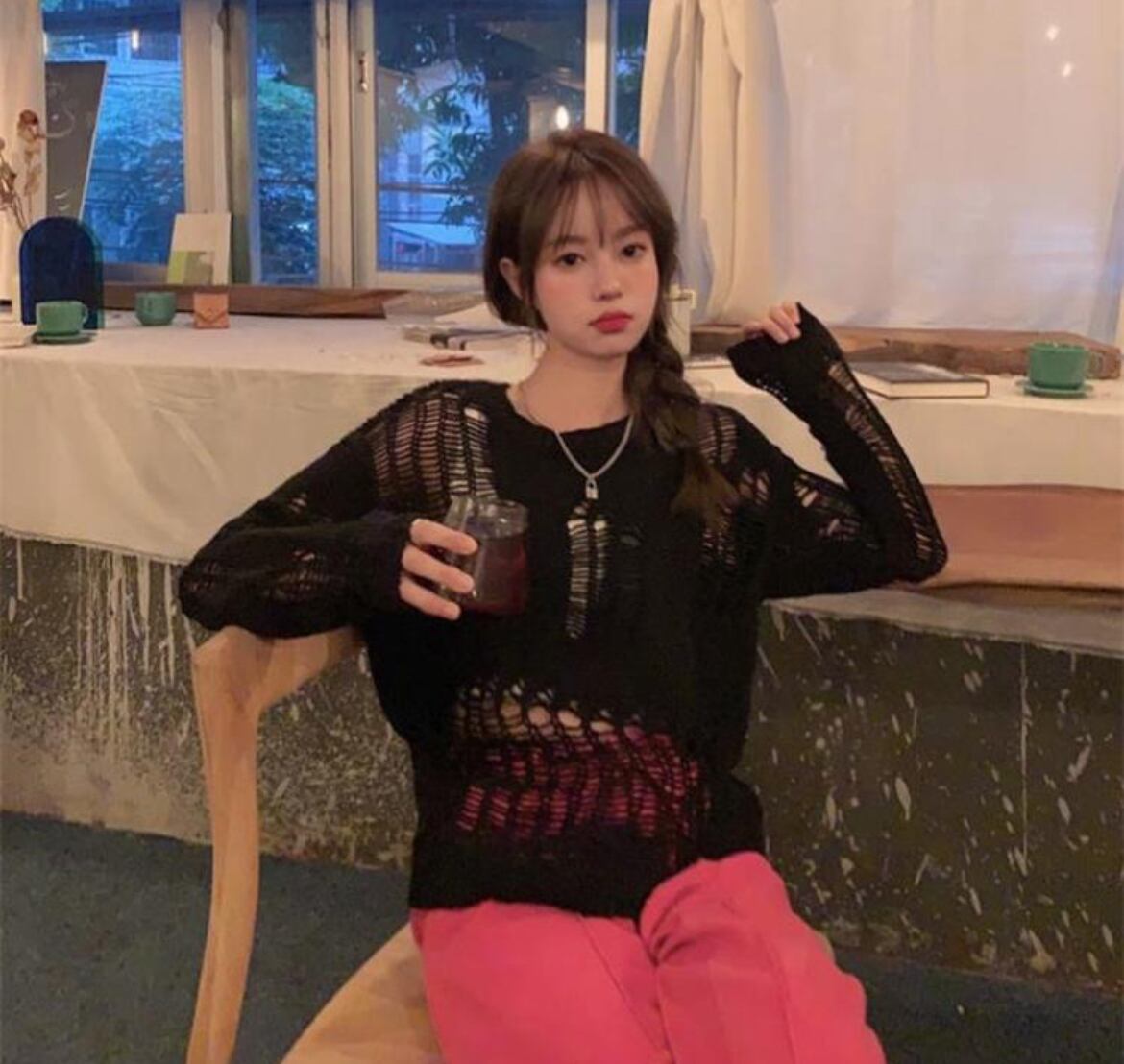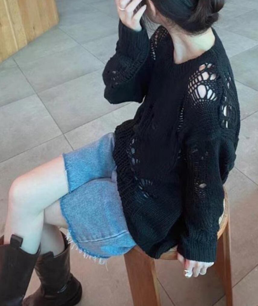 トップス ニット セーター プルオーバー 長袖 クルーネック フェミニン ダメージ ウォッシュ 透かし編み メッシュ 薄手 大人可愛い シンプル カジュアル 上品 おしゃれ こなれ感 ラフ ガーリー ルーズ モード系 存在感 抜け感 ラブリー キュート ナチュラル リラックス 無地 秋 冬 オフィス OL 通勤 デート お出かけ イベント 女子会 休日 ショッピング カフェ 韓国 オルチャン コーデ 楽ちん 体型カバー 普段使い 着回し レイヤード トレンド ゆったり フリーサイズ アイボリー ブラック