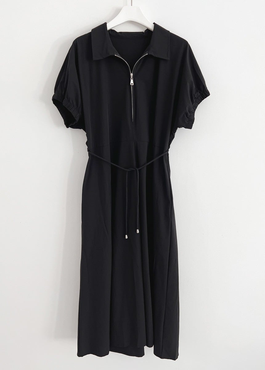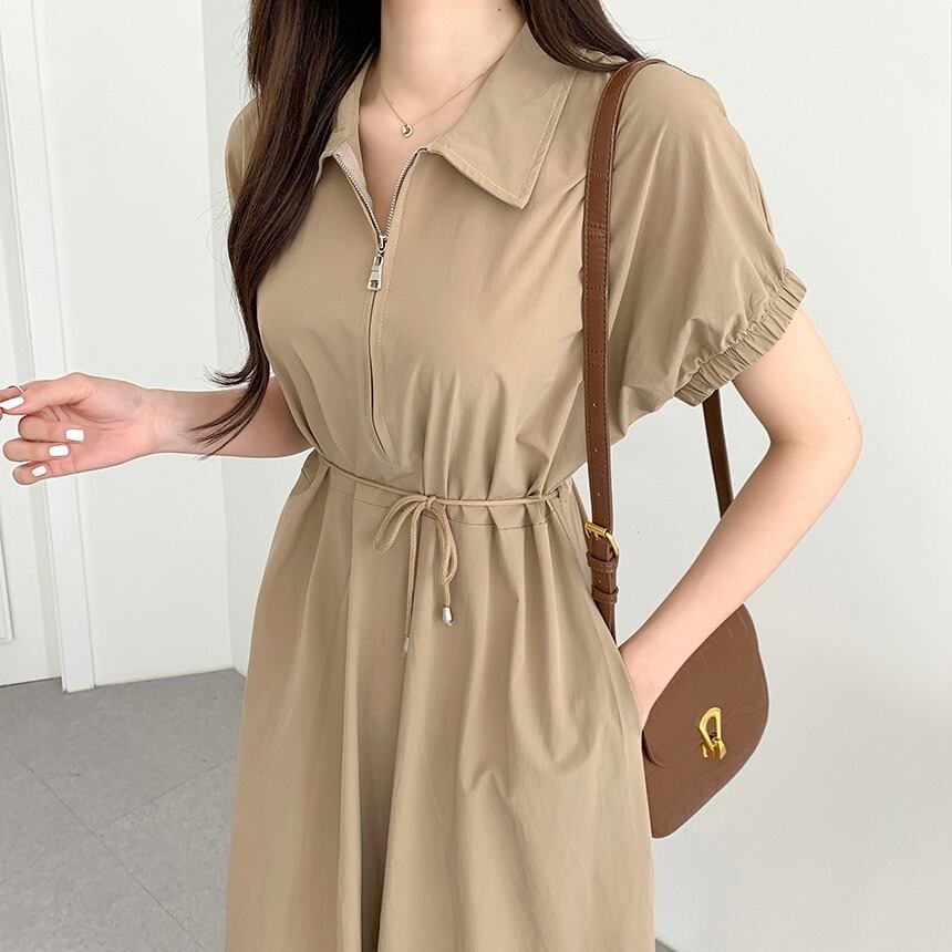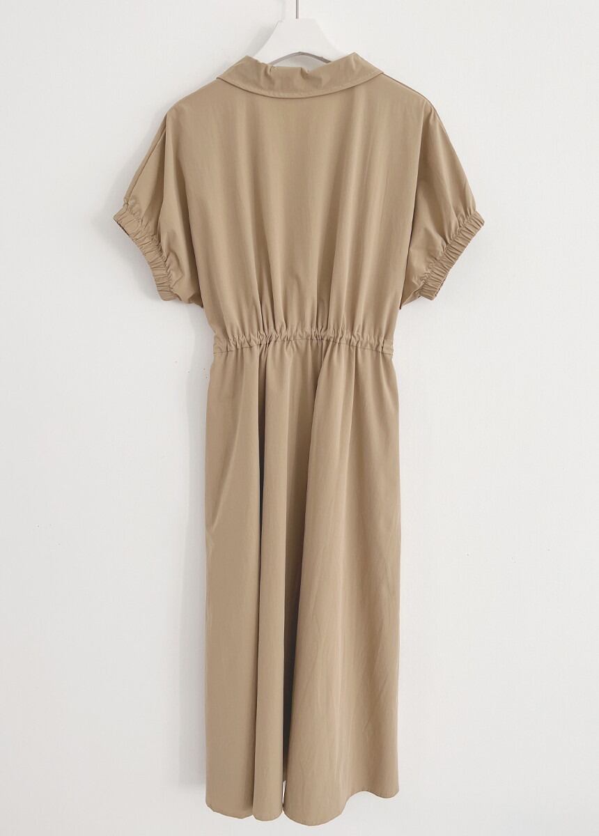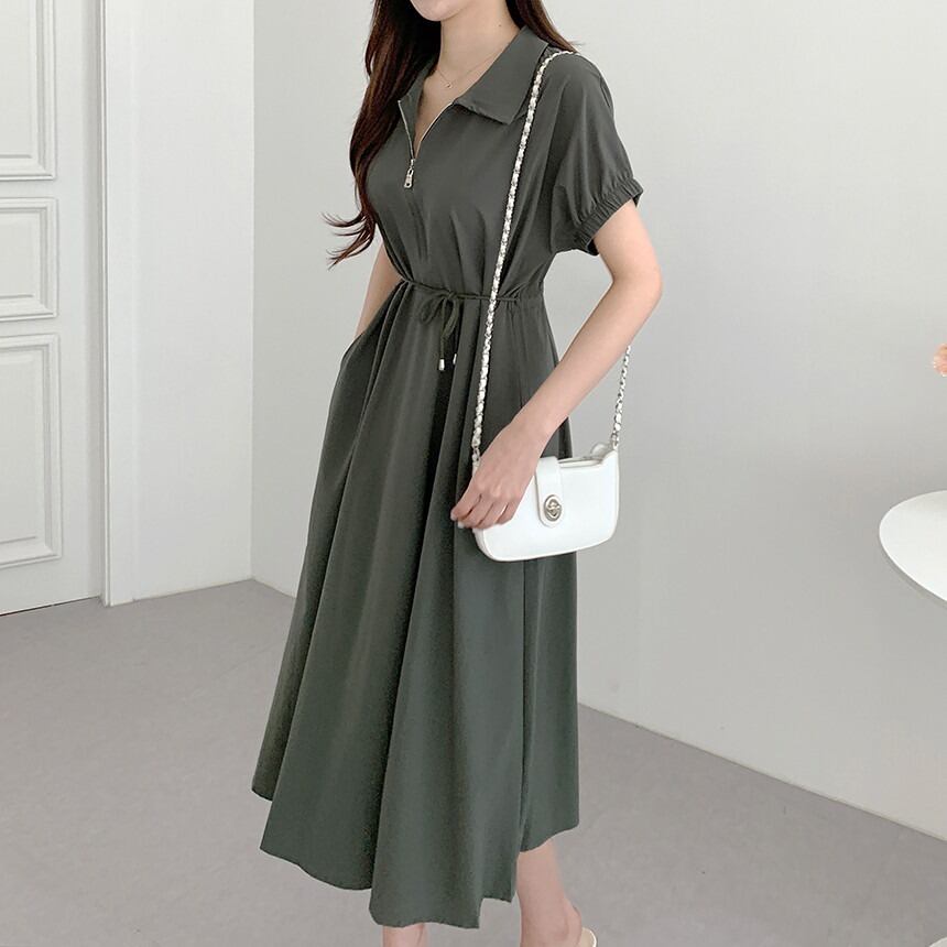 ワンピース レディース セットアップ風 膝下 ミモレ ロング 半袖 ボリューム袖 パフスリーブ Vネック 襟付き スキッパー フレア Aライン ドレープ リボン ウエストマーク ウエストリボン ハイウエスト ポリエステル かわいい 大人可愛い きれいめ シンプル カジュアル 上品 おしゃれ ガーリー エレガント 存在感 フォーマル 都会的 ラグジュアリー ベーシック 無地 ストライプ 春 秋 授業参観 オフィス OL 通勤 お出かけ ショッピング 脚長 普段使い フリーサイズ ブラック カーキ グリーン