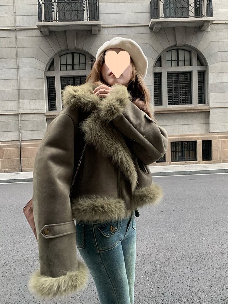 アウター コート ジャケット ショート ショート丈 もこもこ ファー付き 袖あり 長袖 ワイド ファスナー ポケット 厚手 シンプル カジュアル おしゃれ お洒落 無地 秋 冬 10代 20代 30代 レディース 女性用 通勤 通学 デート お出かけ 休日 普段使い 韓国 韓国系 コーデ 暖かい 防寒 インスタ映え S M L XL ゆったり ゆる グリーン 定番カラー 大人カラー