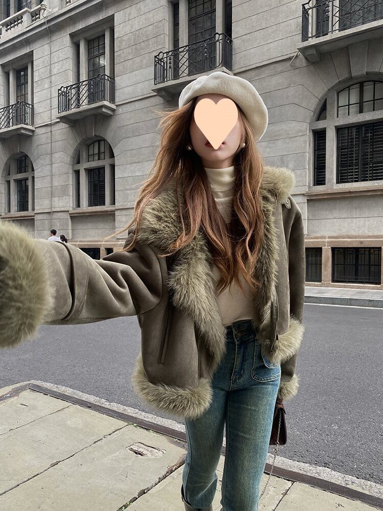 魅力的で暖かみのある、もこもこのファー付きジャケット。