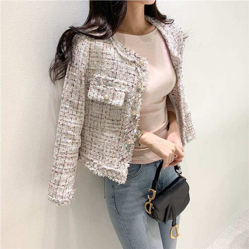 上品なラウンドネックと前開きデザインが魅力のレディースジャケット。