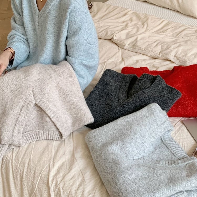 ボリューム袖とドロップショルダーが特徴で、Vネックデザインは女性らしいフェミニンさを演出。