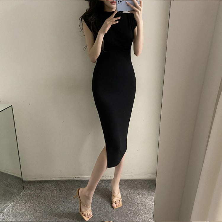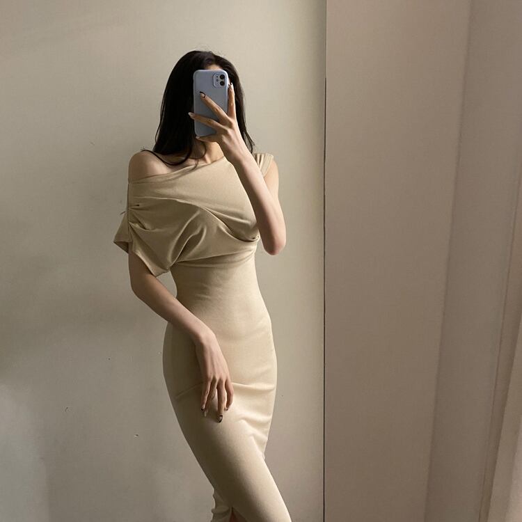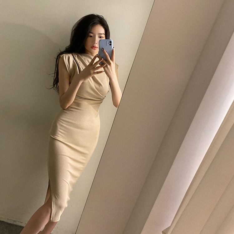 レディース ワンピース ドレス 膝丈 ミモレ フレンチスリーブ ノーカラー タイト スリム 細身 ドレープ フェミニン サイドスリット 大人可愛い きれいめ シンプル 上品 おしゃれ かっこいい クール エレガント 存在感 都会的 ラグジュアリー セクシー 無地 夏 OL デート お出かけ パーティー イベント レストラン 休日 ホテル 合コン コンパ お呼ばれ オケージョン モテ インスタ映え スタイルアップ ボディコンシャス S M L XL 黒 ブラック ベージュ ベーシックカラー 大人カラー