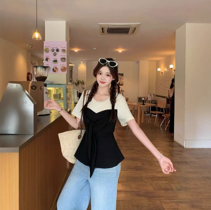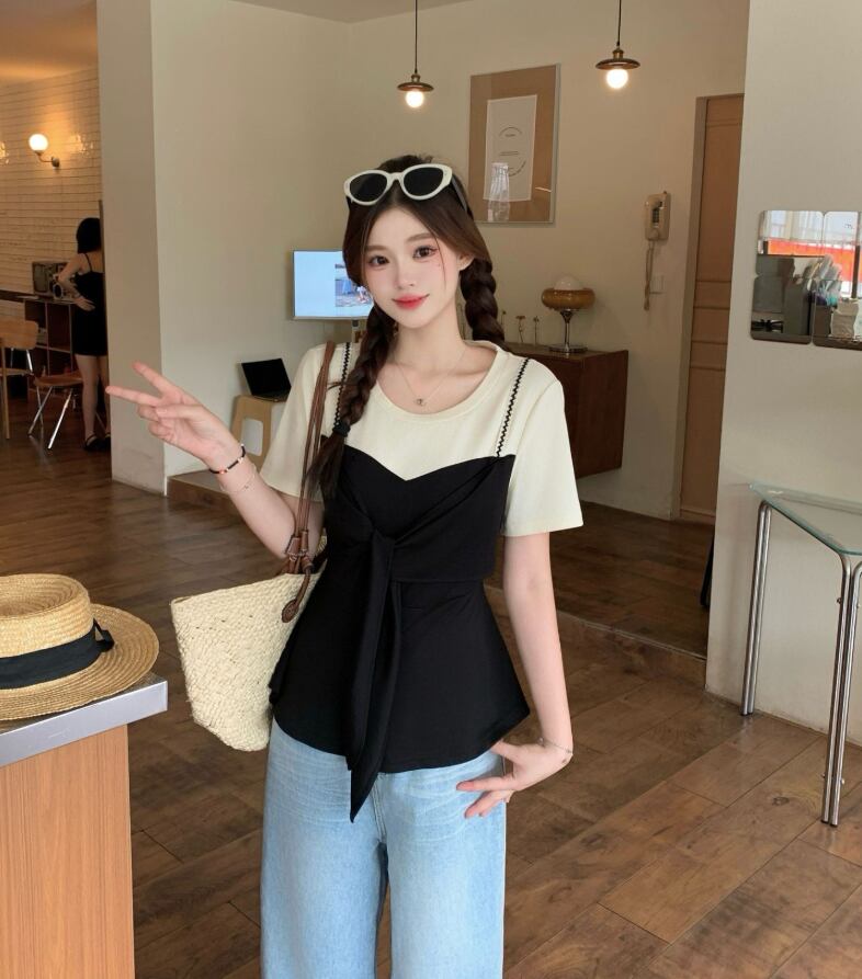 レディース トップス カットソー フェイクツーピース 半袖 ラウンドネック クルーネック かわいい 大人可愛い きれいめ シンプル カジュアル 上品 おしゃれ レトロ こなれ感 ラフ ガーリー ルーズ 個性的 モード系 エレガント モダン 主役級 存在感 抜け感 カレッジ風 学生風 カントリー アクティブ ロマンティック ナチュラル 無地 夏 デート お出かけ お泊まり 重ね着 韓国 オルチャン コーデ 楽ちん プレゼント 普段使い 着回し モテ 清楚 トレンド 流行 インスタ映え 定番 L XL 2XL
