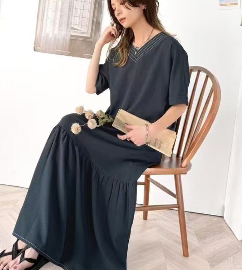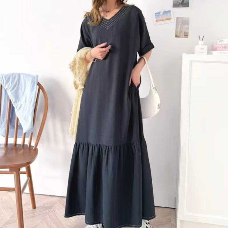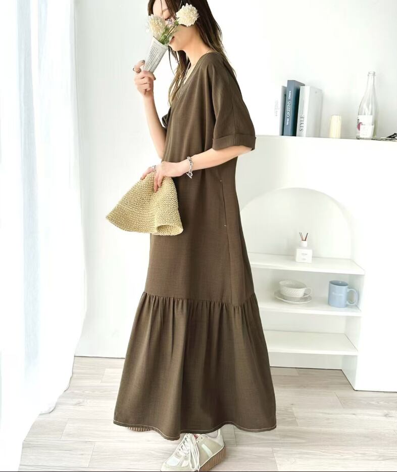 レディース スカート ワンピース ドレス つなぎ 膝下 ロング 丈長 半袖 Vネック 襟なし ワイド フレア かわいい 大人可愛い きれいめ シンプル カジュアル 上品 おしゃれ レトロ こなれ感 ラフ ガーリー ルーズ モード系 エレガント モダン 主役級 存在感 抜け感 ラブリー キュート 都会的 クラシカル カントリー ナチュラル 清潔感 涼しげ リラックス 軽やか 通気性 爽やか 無地 春 夏 デート お出かけ お泊まり パーティー 公園 女子会 休日 ショッピング ゆったり ゆる ワンサイズ ブ