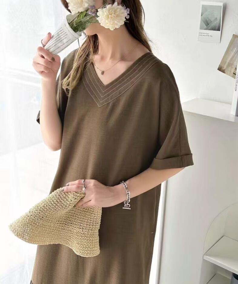 半袖のVネックに襟がないシンプルなデザインが、都会的な洗練さをプラスします。