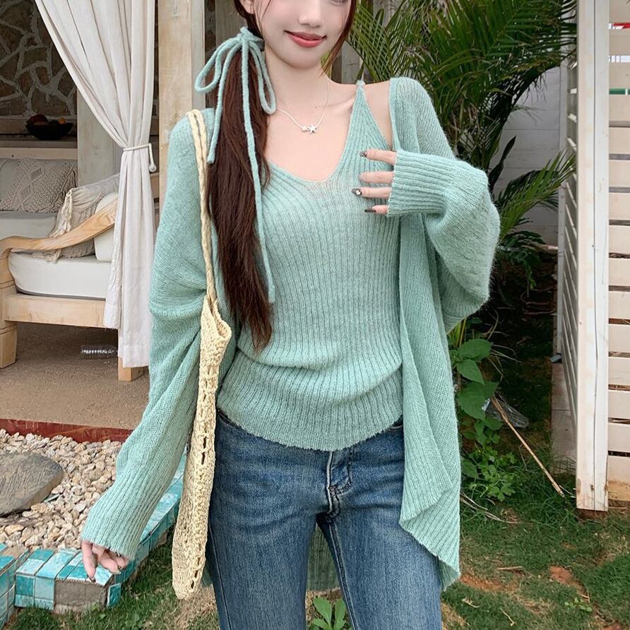 レディース トップス ニット カーディガン アンサンブル 2点セット ヘアリボン付き キャミソール 丈長 長袖 ボリューム袖 ドロップショルダー 萌袖 Vネック フェミニン リブ 前開き かわいい 大人可愛い おしゃれ こなれ感 ガーリー 個性的 存在感 キュート ロマンティック セクシー 無地 春 秋 OL 学生 デート お出かけ 旅行 公園 女子会 休日 ショッピング ライブ 合コン コンパ カフェ ランチ 重ね着 コーデ 普段使い 着回し モテ インスタ映え ワンサイズ 緑 グリーン 春カラー