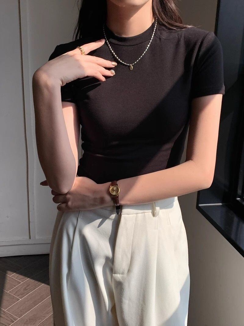 レディース トップス プルオーバー Tシャツ ショート クロップド丈 半袖 クルーネック 襟なし ノーカラー タイト スリム 細身 スマート シンプル カジュアル おしゃれ こなれ感 抜け感 無地 春 夏 学生 学校 通学 デート お出かけ イベント 旅行 公園 休日 ショッピング ライブ コンパ カフェ フェス ランチ 韓国 オルチャン コーデ 普段使い 着回し M L XL 2XL 大きいサイズ 白 ホワイト 黒 ブラック ライトグレー モノトーン ベーシックカラー 大人カラー