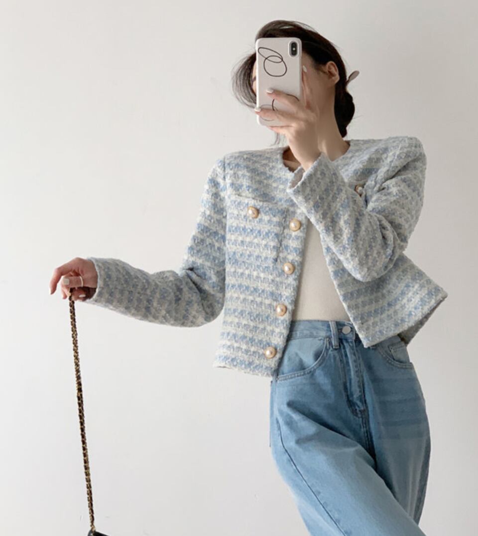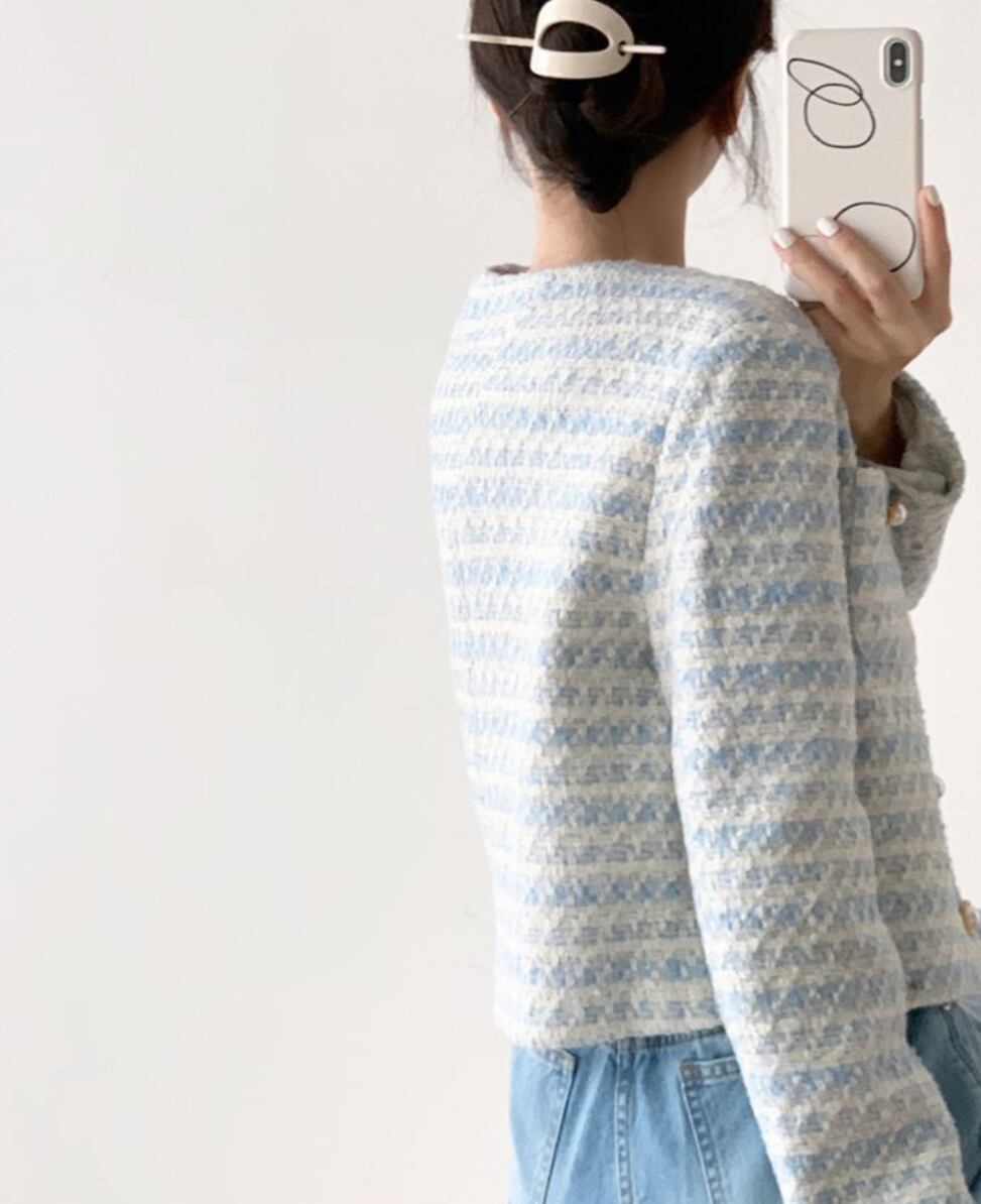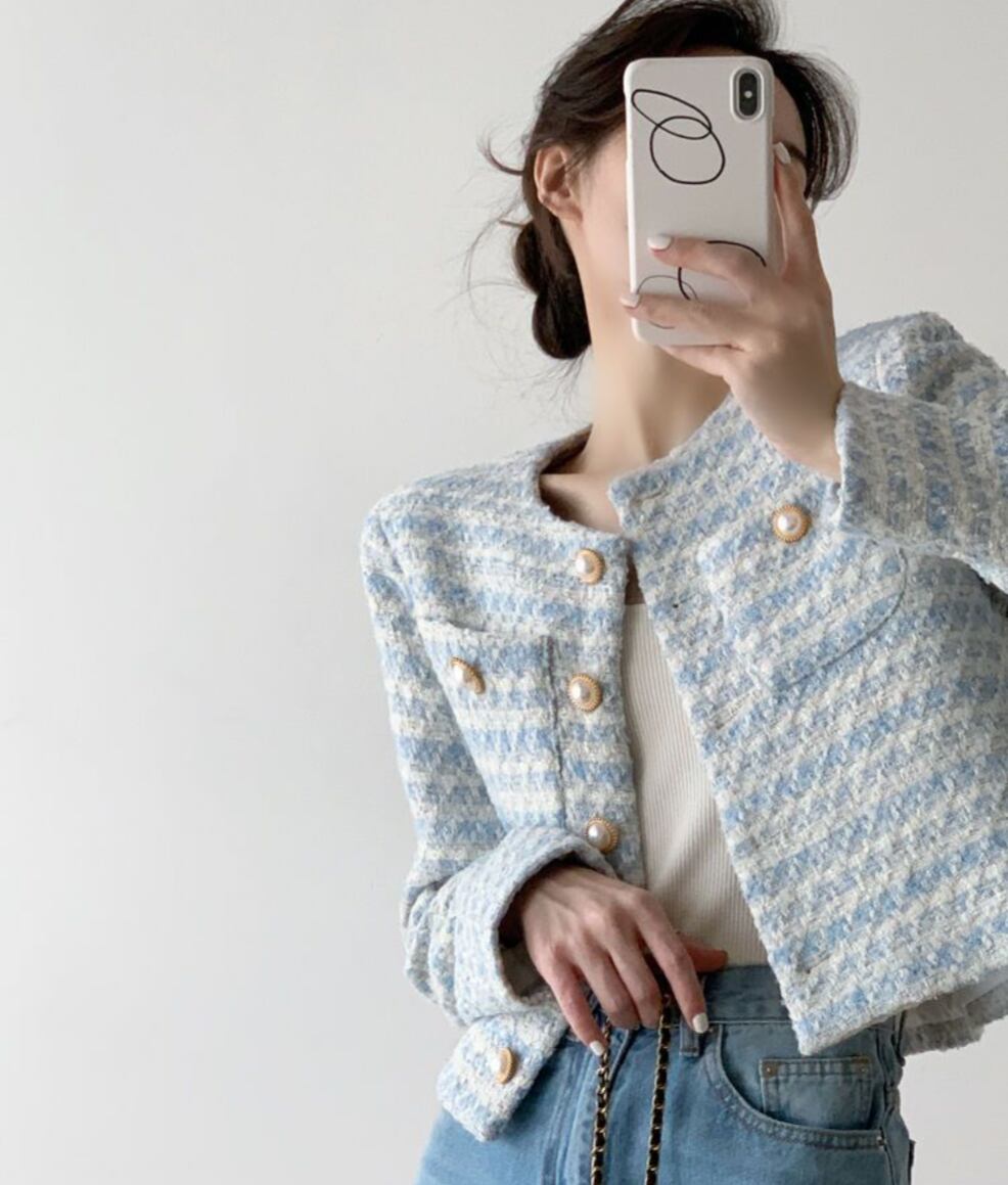 襟なしのデザインが大人可愛い印象を与、ガーリーな雰囲気の中にも上品さを兼ね備えています。普段使いからデート、お出かけ、パーティーシーンまで幅広く活用できる一枚です。