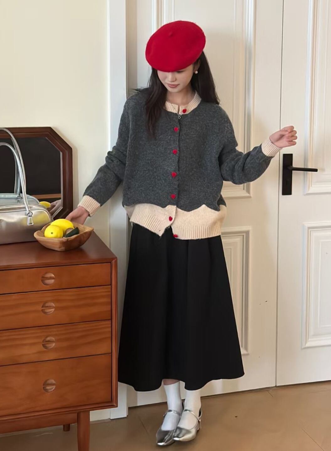 ハートボタンが特徴で、カジュアルなお出かけから特別なデートまで、幅広いシーンで大活躍します。バイカラー配色がアクセントとなり、こなれ感を演出。