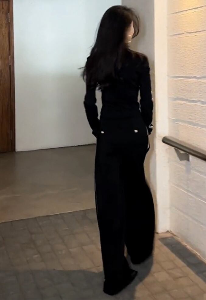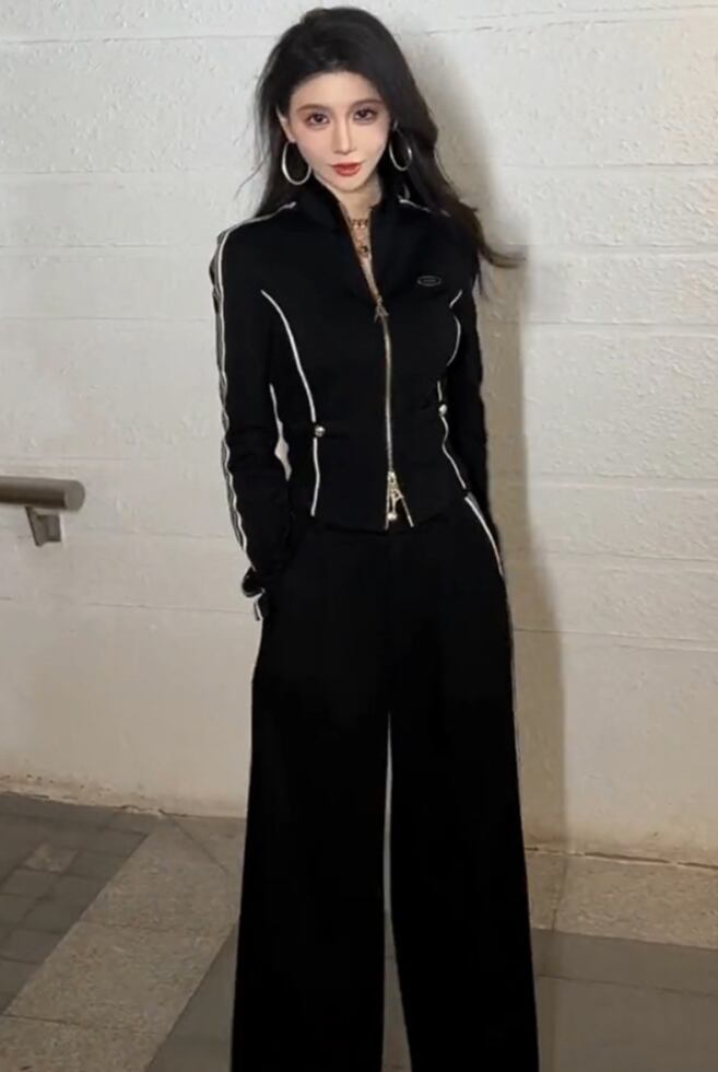 前開きのハイネックトップスとテーパードパンツの組み合わせは、シンプルながらスタイリッシュな印象を与え、スポーティーな雰囲気も演出。バイカラー配色が目を引き、こなれ感をプラスします。