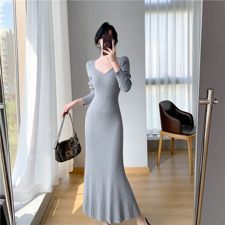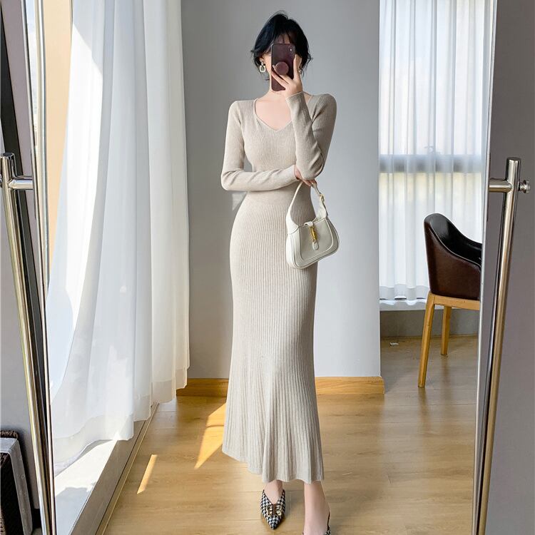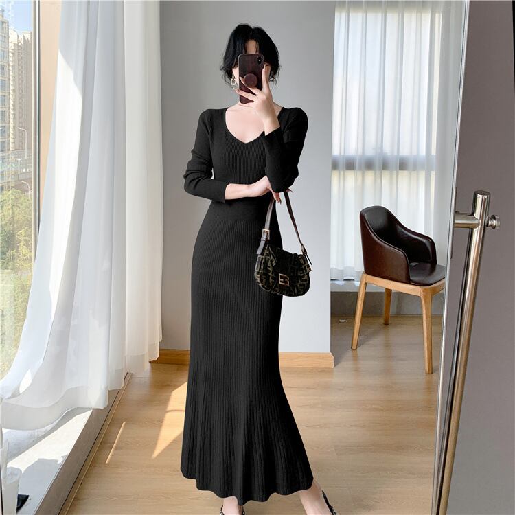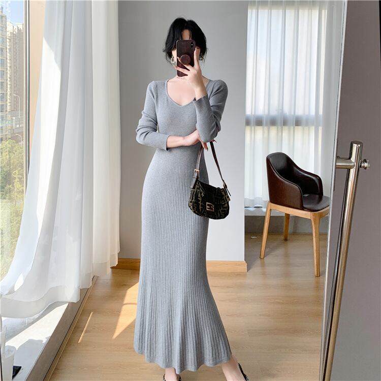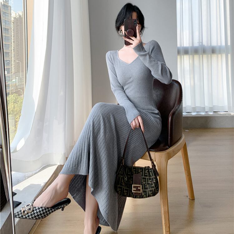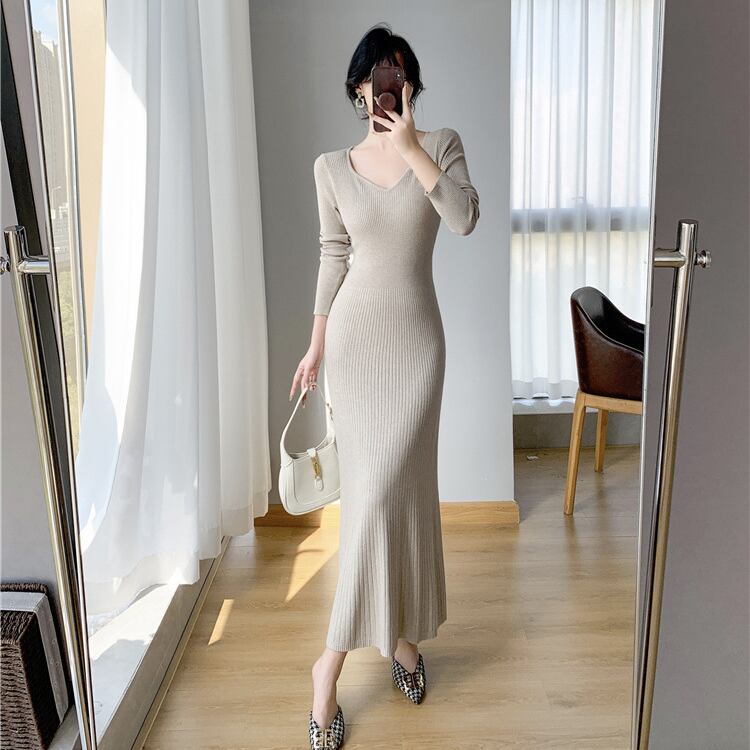 レディース ワンピース ニットワンピ ミモレ 長袖 Vネック 襟なし ノーカラー セミフレア タイト Aライン フェミニン リブ リブニット コンサバ かわいい 大人可愛い きれいめ シンプル 上品 おしゃれ こなれ感 エレガント 存在感 キュート 都会的 ロマンティック 軽やか セクシー 無地 秋 冬 OL デート お出かけ 旅行 女子会 休日 バカンス カフェ ランチ お呼ばれ コーデ 普段使い モテ ボディコンシャス S M L XL 黒 ブラック グレー カーキ ベーシックカラー 大人カラー