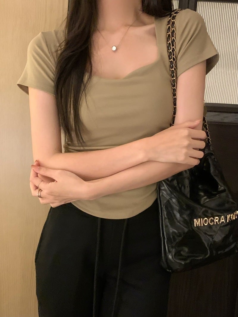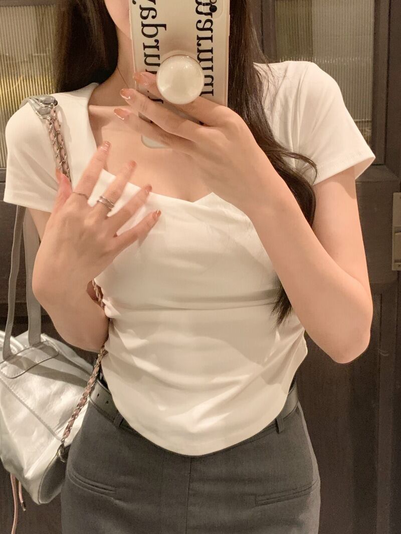 ペンタゴンネックがデコルテラインを美しく引き立てる、女性らしさ溢れるショート丈トップス。