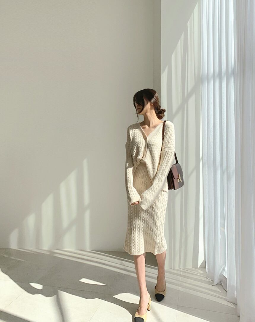 柔らかな肌触りと女性らしいシルエットが魅力のニットセットアップです。ケーブル編みの表情豊かなデザインが、秋冬の装いにぬくもりをプラスします。