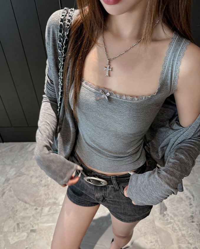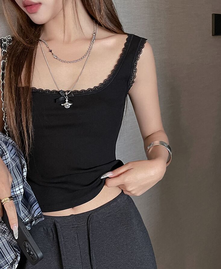 柔らかなレースが施され、肌見せスタイルでも大人可愛い印象を与えてくれます。シンプルながらもおしゃれさを兼ね備え、カジュアルなコーディネートから、きれいめスタイルまで幅広く活躍します。春夏の涼しげな装いにぴったりなアイテムです!