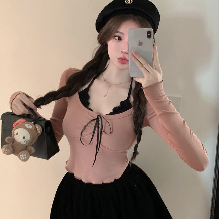 レディース トップス カットソー フェイクツーピース クロップド丈 長袖 萌袖 Uネック ホルターネック タイト スリム 細身 フェミニン メロウフリル フリル リボン 切り替えデザイン 肌見せ かわいい カジュアル おしゃれ こなれ感 ガーリー 存在感 ラブリー キュート ロマンティック セクシー 無地 春 秋 OL 学生 デート お出かけ 旅行 公園 女子会 休日 ショッピング 合コン コンパ カフェ ランチ コーデ モテ スタイルアップ ボディコンシャス 重ね着風 S M L ピンク 春カラー