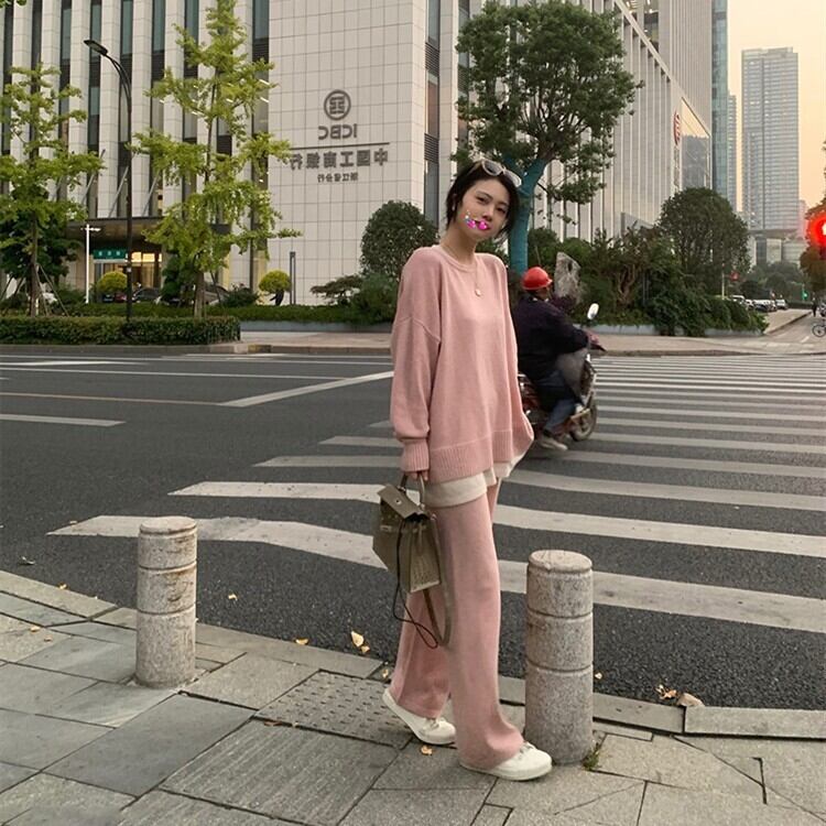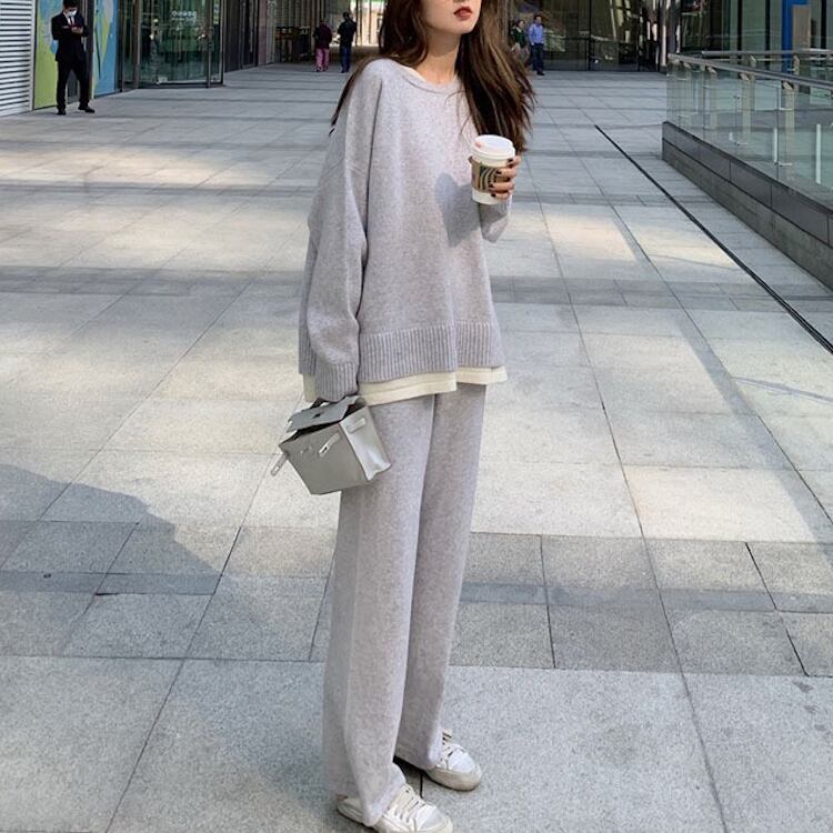ゆったりとしたワイドシルエットが魅力の、ニットトップス&パンツのセットアップ。