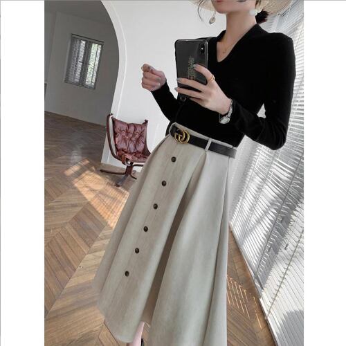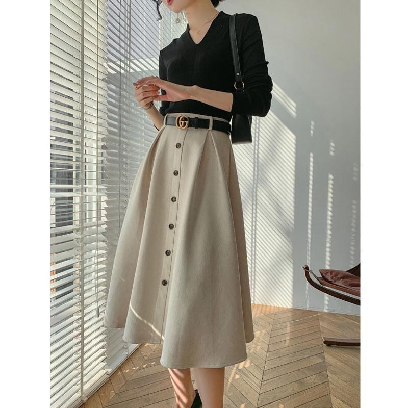 レディース スカート トップス カットソー セットアップ アンサンブル ミモレ 長袖 Vネック 襟なし ノーカラー フレア Aライン フェミニン ハイウエスト ボタン かわいい 大人可愛い シンプル 上品 おしゃれ こなれ感 存在感 清潔感 無地 春 秋 ママ OL 学生 デート お出かけ 旅行 レストラン 公園 女子会 休日 ショッピング コンサート 合コン コンパ カフェ ランチ お呼ばれ コーデ 普段使い 着回し モテ 清楚 S M L XL 黒 ブラック ベージュ ベーシックカラー 大人カラー