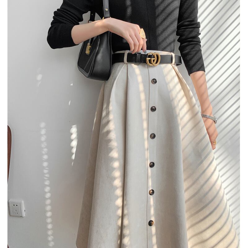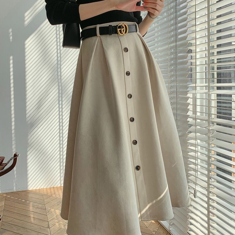 ハイウエスト切り替えとAラインシルエットがスタイルアップを叶え、フロントボタンが女性らしいアクセントを添えます。