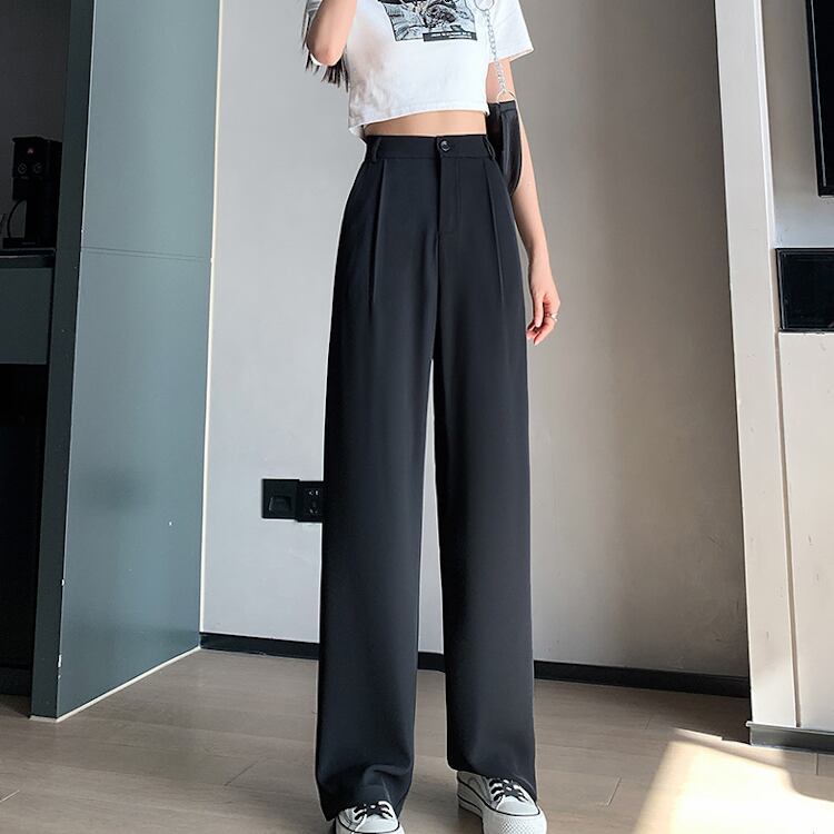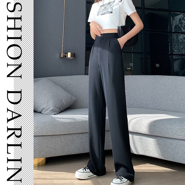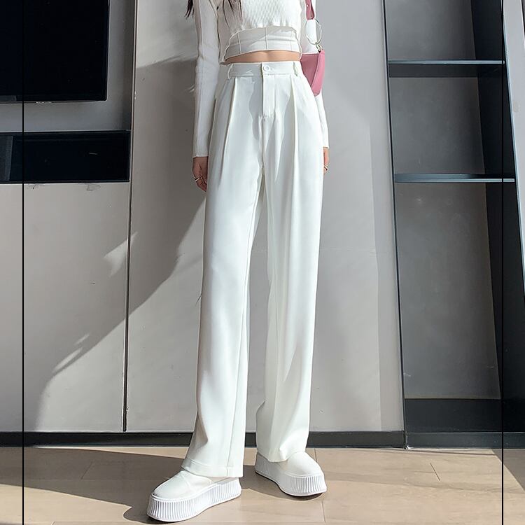脚のラインをまっすぐ美しく見せる、フルレングスのハイウエストストレートパンツ。