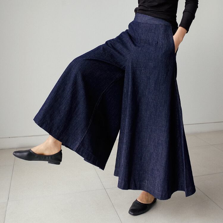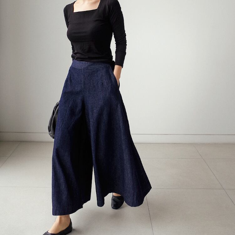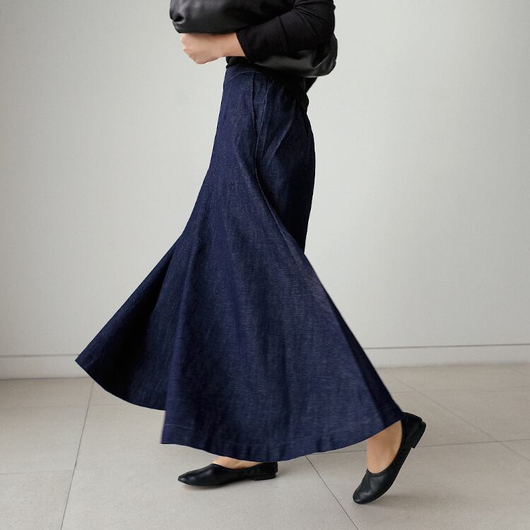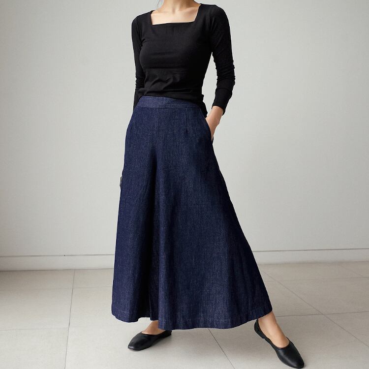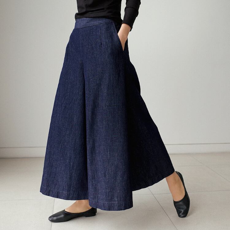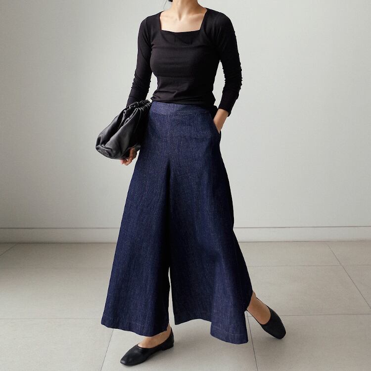 ブルーデニムの無地デザインは、カジュアルからフェミニン、ストリートまで幅広く対応。
