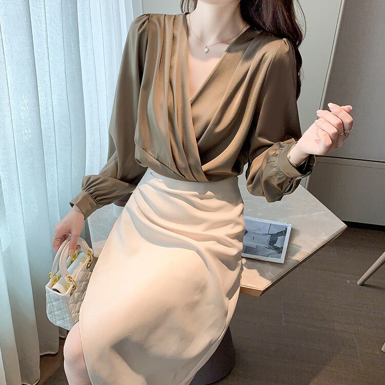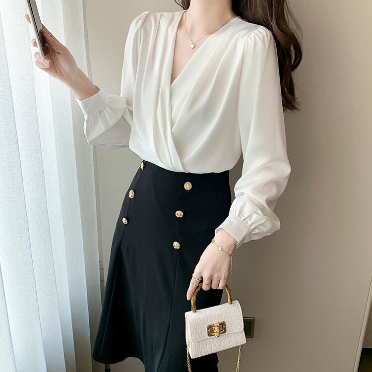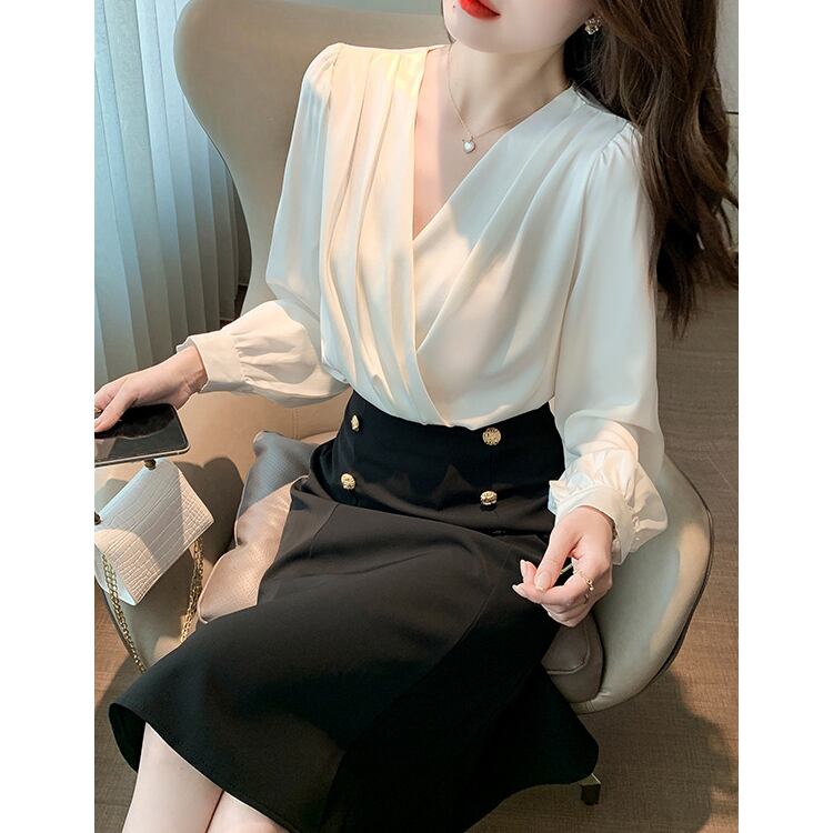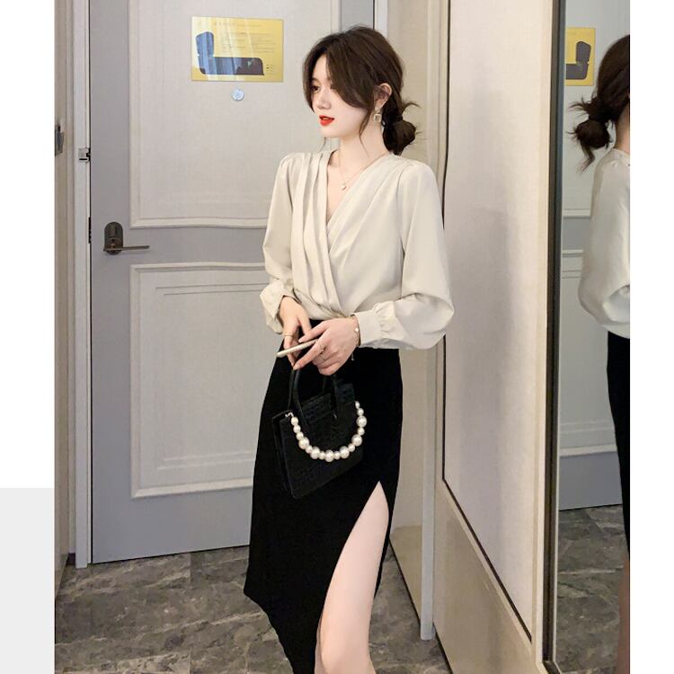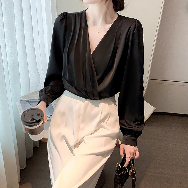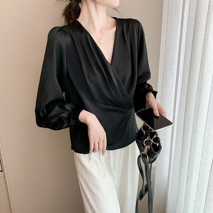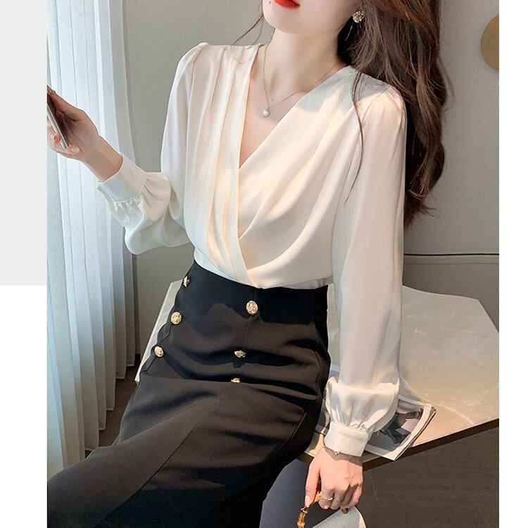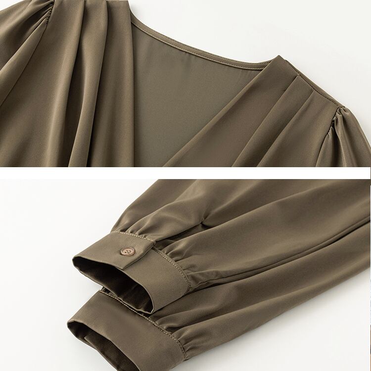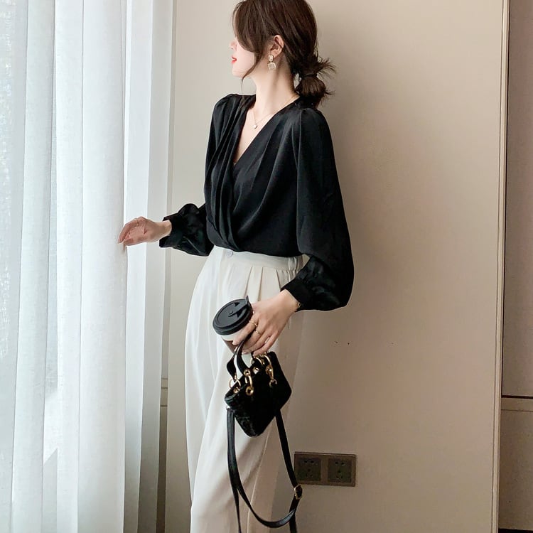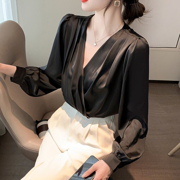 やわらかなドレープとカシュクール風のVネックが上品な印象を与える、長袖ブラウス。