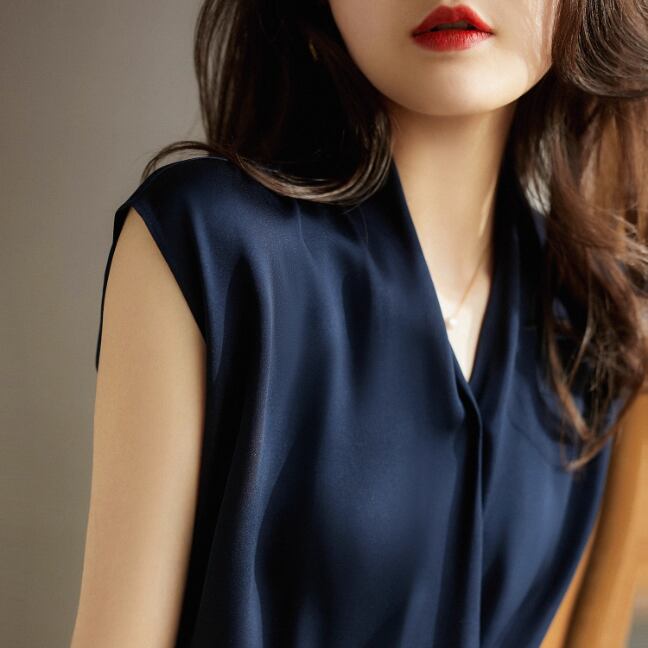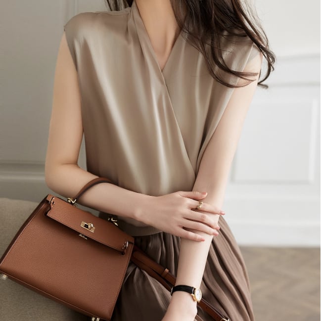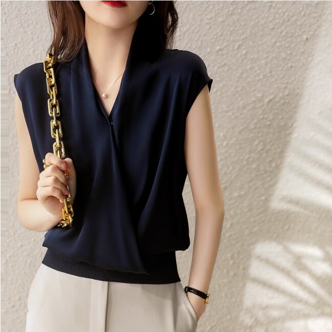 やわらかなドレープが美しい、カシュクールデザインのVネックブラウス。