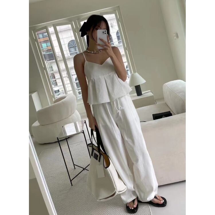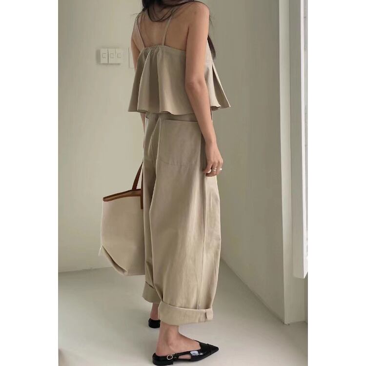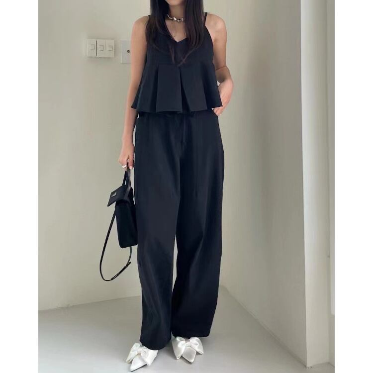 Vネックキャミソールとワイドパンツの上下セットアップ。