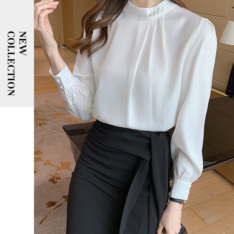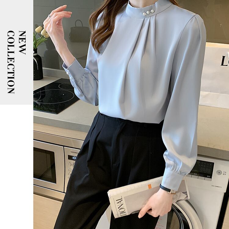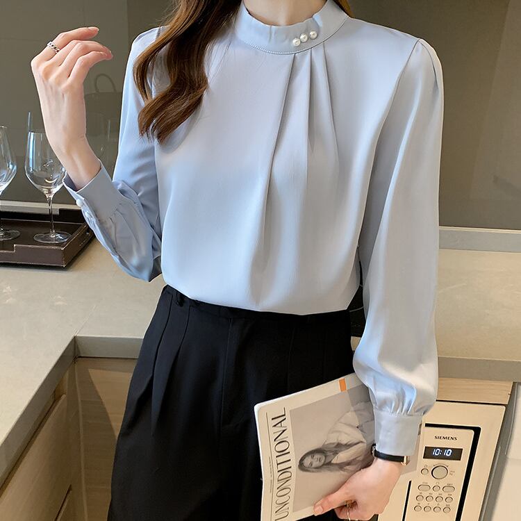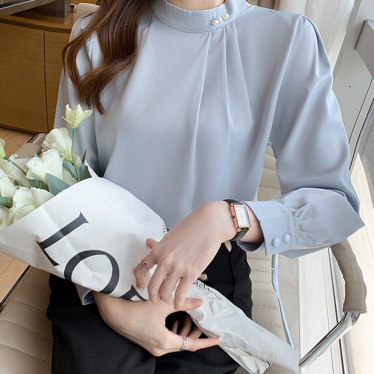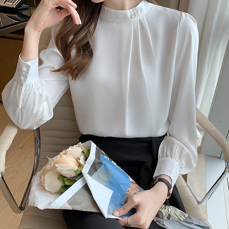 エレガントで洗練された印象を与える、スタンドカラーの長袖ブラウス。