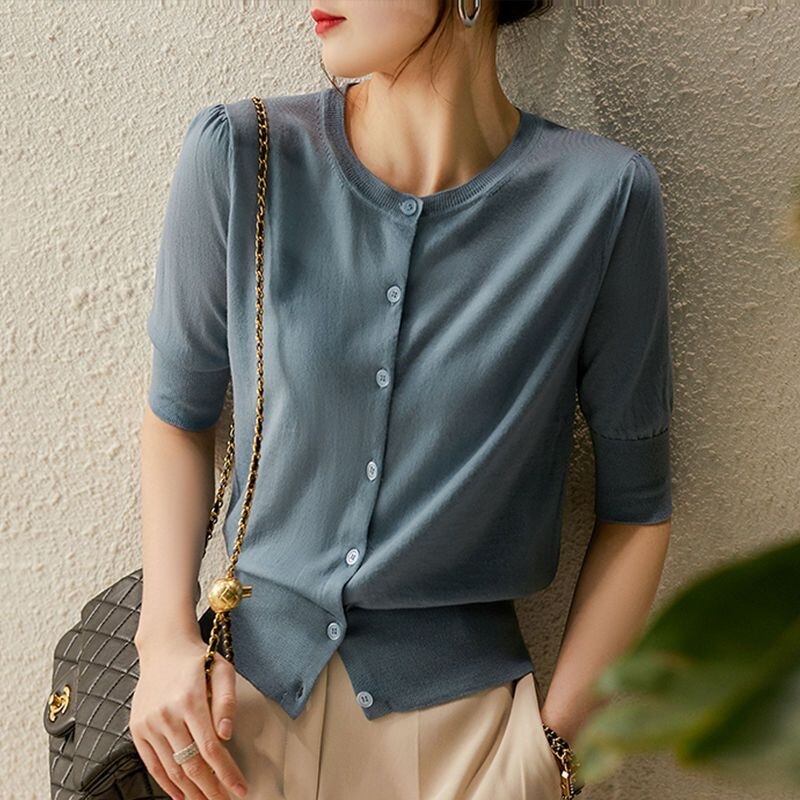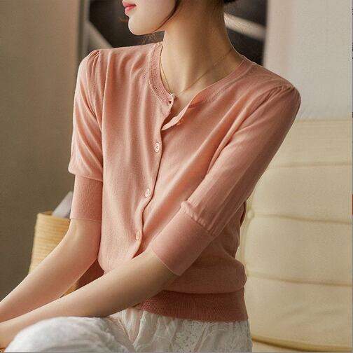 コンパクトなシルエットで女性らしさを引き立てる 5分袖ニットカーディガン。