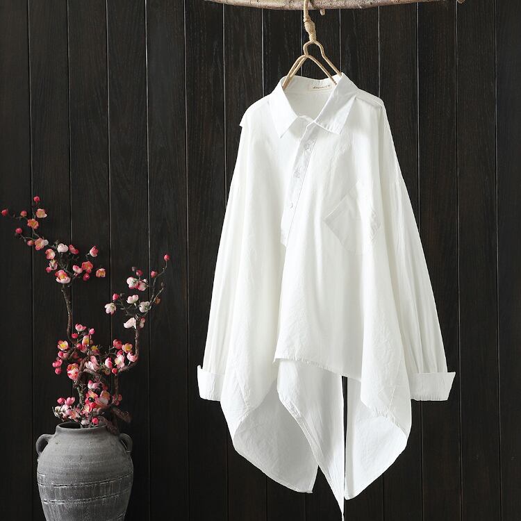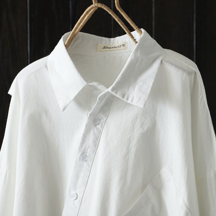 個性的なシルエットで魅せる アシンメトリーデザイン丈長シャツブラウス。