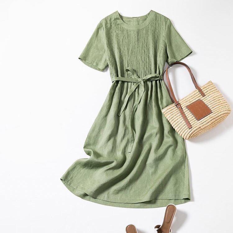 膝下のミディアム丈で、涼しげな半袖デザインが特徴です。
