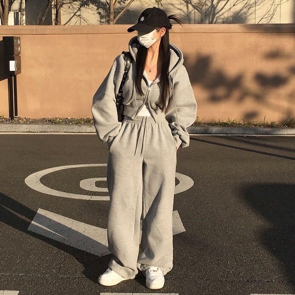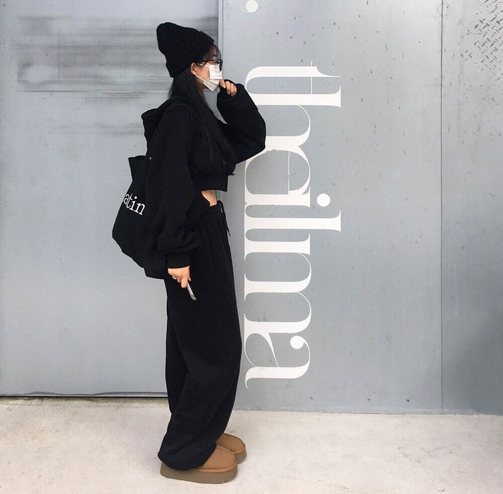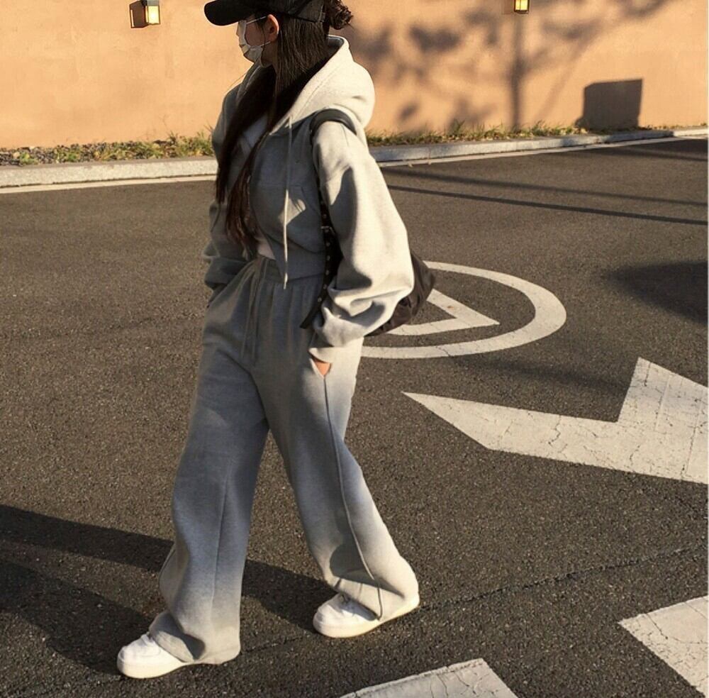 おしゃれでこなれ感を演出する、ショート丈のパーカーとワイドなスウェットパンツのセットアップ。