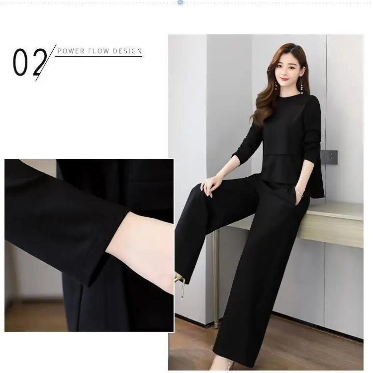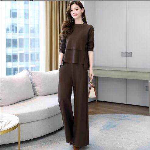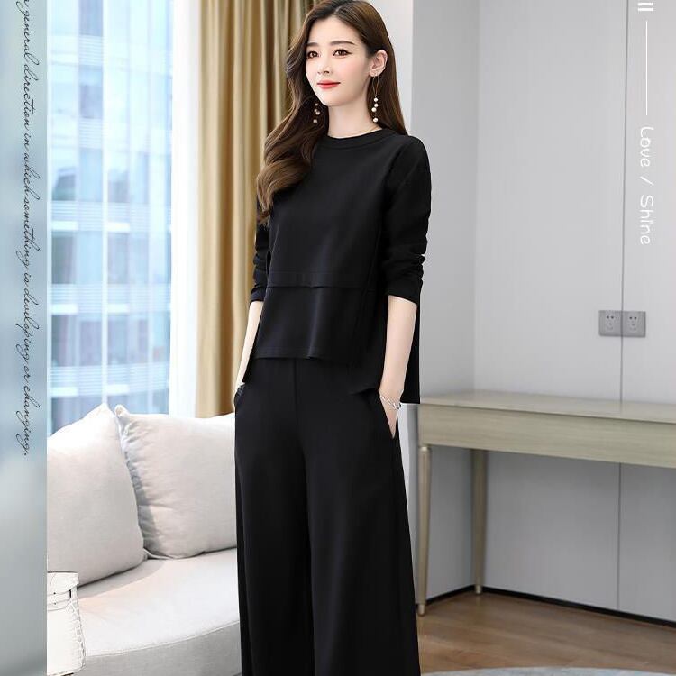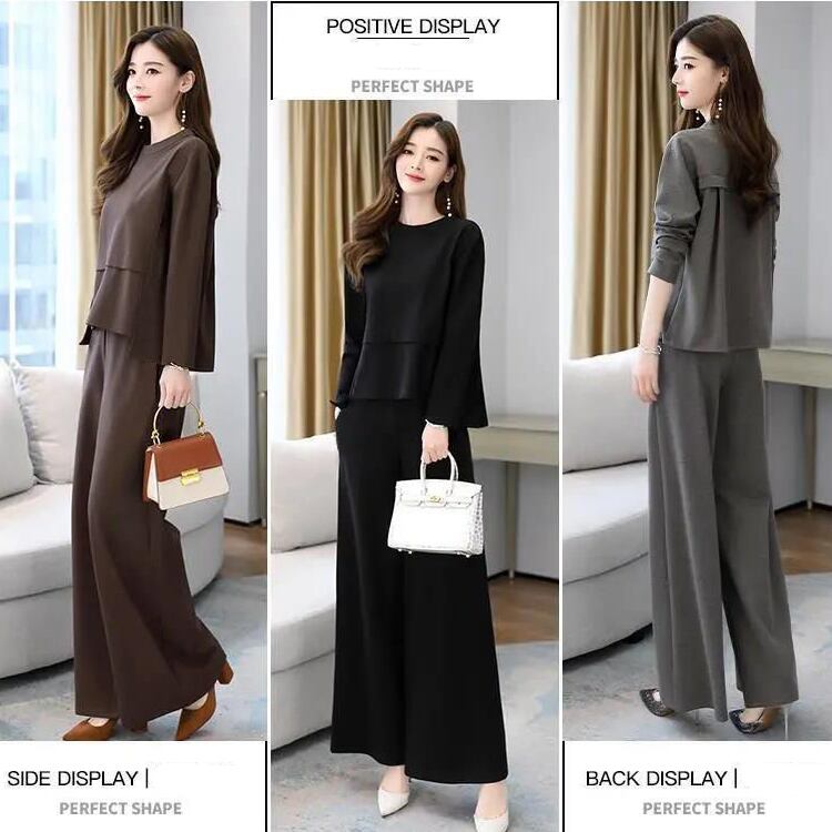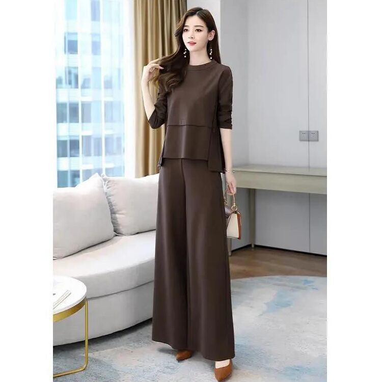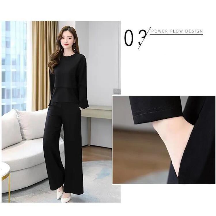 レディース トップス パンツ ボトムス カットソー セットアップ アンサンブル 2点セット 上下セット フレア ワイドパンツ ロング 長袖 ラウンドネック フェミニン 切り替えデザイン 大人可愛い 上品 おしゃれ こなれ感 リラックス 軽やか 無地 春 秋 ママ OL デート お出かけ レストラン ショッピング コーデ 楽ちん 体型カバー 普段使い 着回し スタイルアップ M L XL 2XL 3XL 4XL 大きいサイズ ゆったり ブラック ブラウン ダークグレー ベーシックカラー 大人カラー 秋カラー