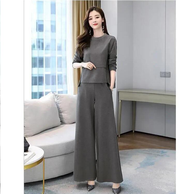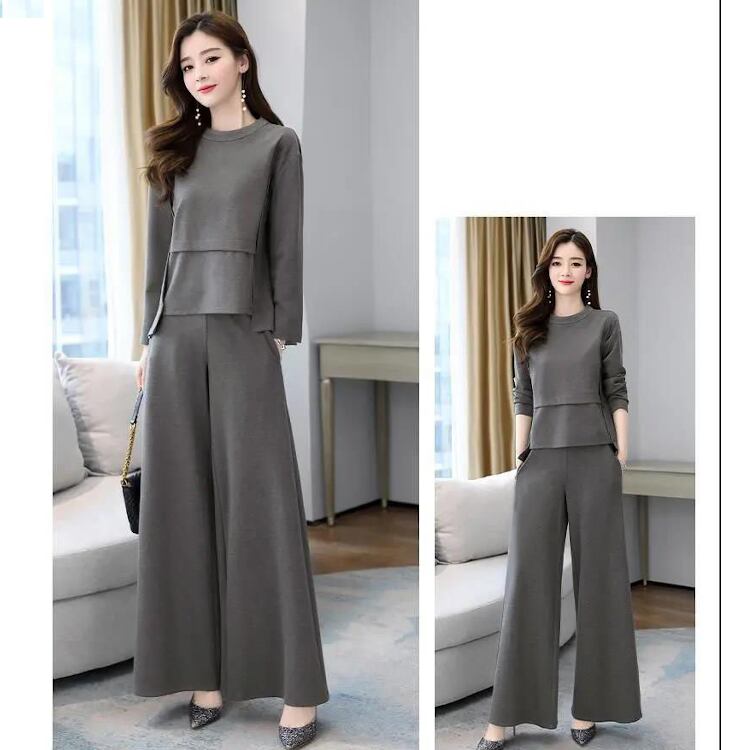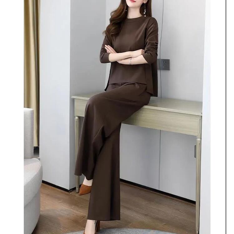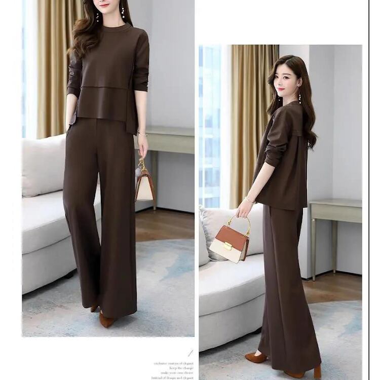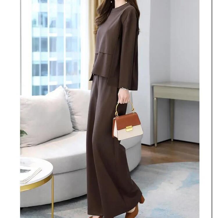 シンプルながらも女性らしさを引き立てる長袖カットソーと、ゆったりフレアシルエットのワイドパンツを組み合わせた上品なアンサンブルです。