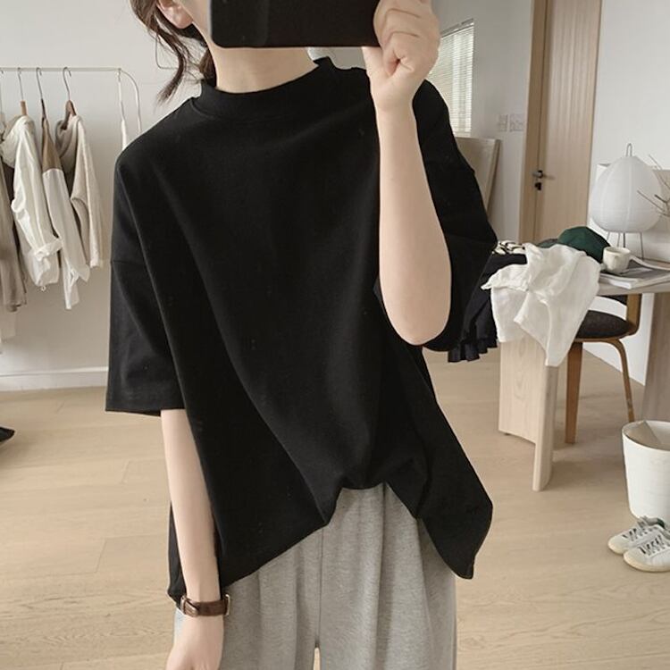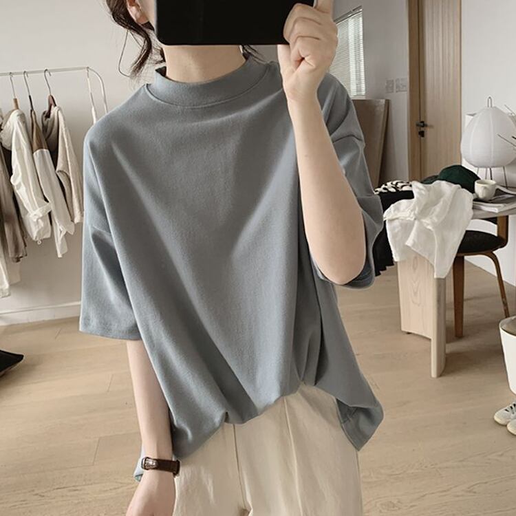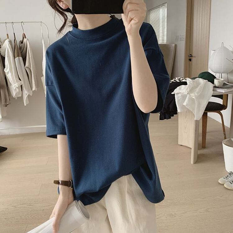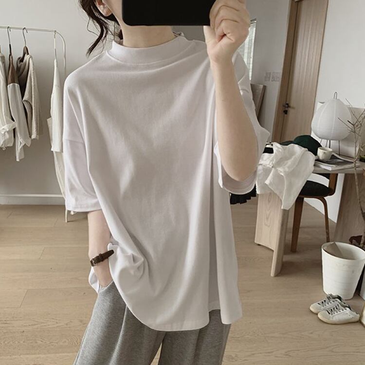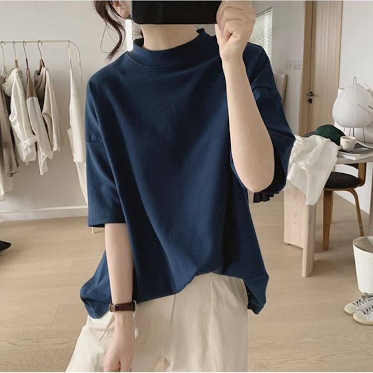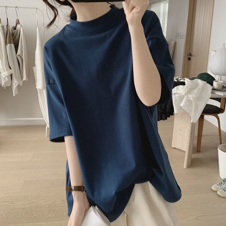 レディース トップス Tシャツ 丈長 5分袖 ドロップショルダー モックネック ワイド オーバーサイズ ストリート かわいい シンプル カジュアル おしゃれ かっこいい こなれ感 ラフ マニッシュ 存在感 抜け感 ベーシック ナチュラル 涼しげ リラックス 軽やか 無地 夏 学生 デート お出かけ アウトドア キャンプ 旅行 公園 女子会 休日 ショッピング ライブ コーデ 楽ちん 体型カバー 普段使い 着回し 定番 L XL 2XL 3XL 4XL 大きいサイズ ホワイト ブラック ブルー ターコイズ