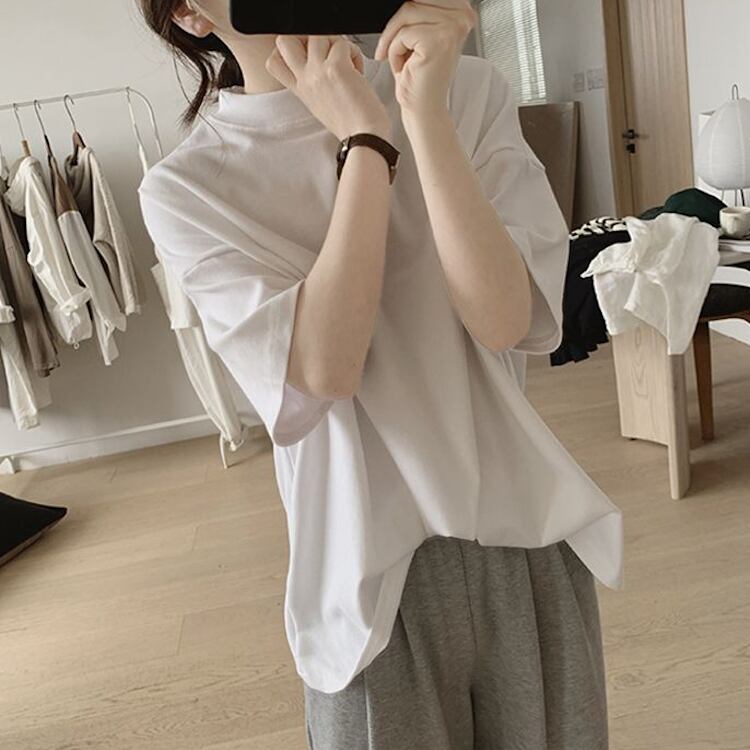モックネック仕様でさりげなく大人っぽさをプラスしつつ、体型カバーもできる丈感で着回し力抜群。