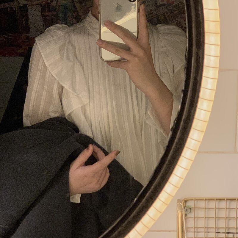 ポイントは、きちんと感を演出する モックネック×カフスリーブ デザイン。切り替えフリルとほんのり透け感のある素材が、ガーリーでロマンティックな雰囲気をプラスしてくれます。ストライプ柄で縦ラインを強調し、体型カバー&スタイルアップも叶う優秀アイテム。