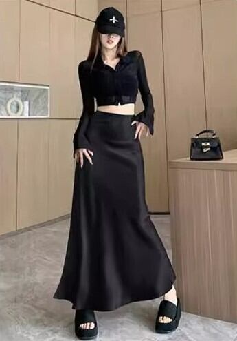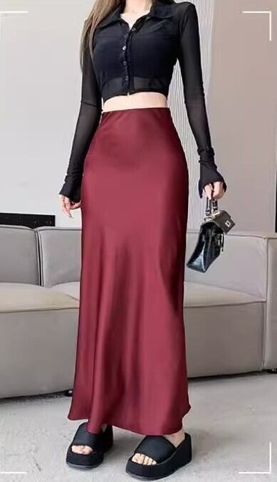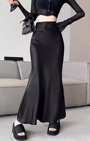 上品な艶感が魅力のマーメイドラインスカートです。身体のシルエットをきれいに見せつつ、裾に向かって広がるラインが女性らしい優雅さを演出します。