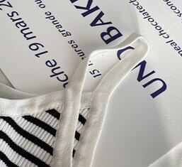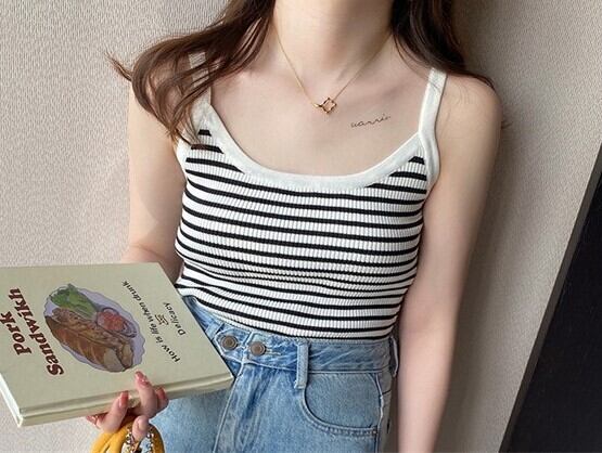 爽やかな印象を与えるボーダー柄リブニットキャミソールです。伸縮性のあるストレッチ素材で身体にフィットし、細身のシルエットをすっきりと引き立てます。