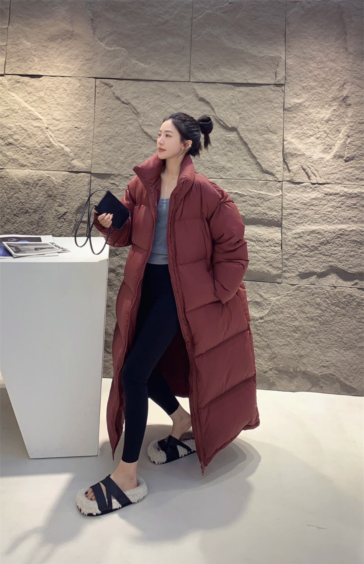 厚手のダウン素材を使用したロング丈で、寒い冬の季節でも暖かく過ごせます。ハイネックデザインは防寒性を高め、ファスナー付きのため脱ぎ着もストレスフリー!ポケットも付いているので、デートやお出かけ、普段使いに大活躍します。カジュアルからきれいめまで幅広くコーディネートが楽しめる、主役級の存在感を持ったアイテムです。