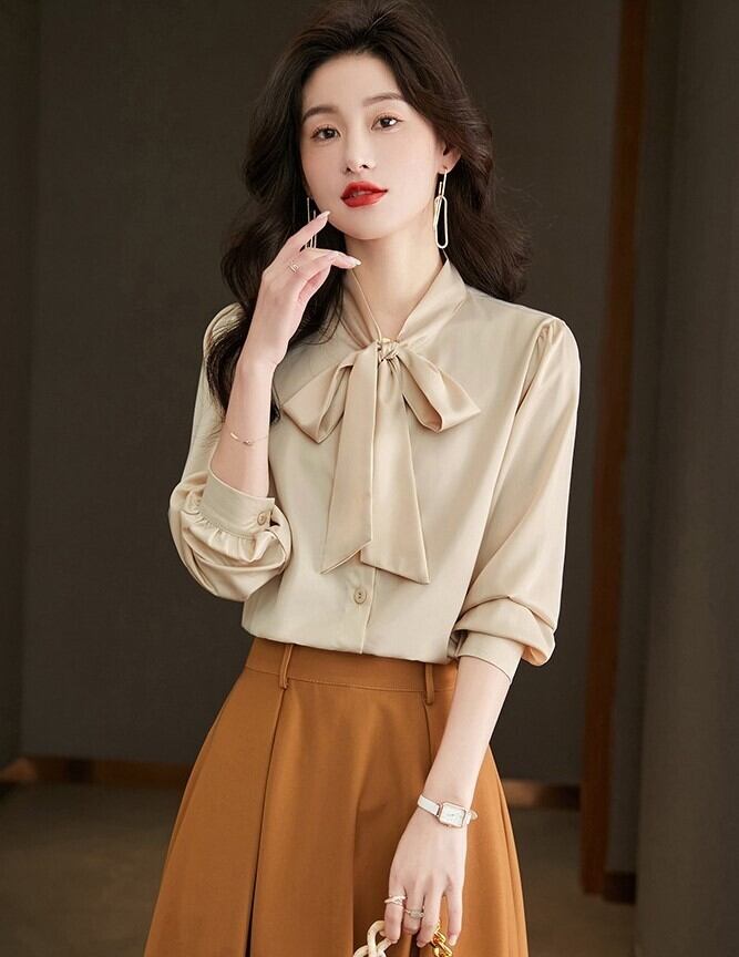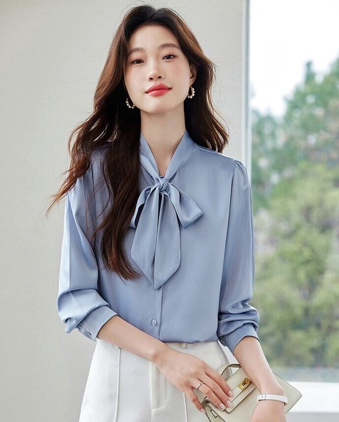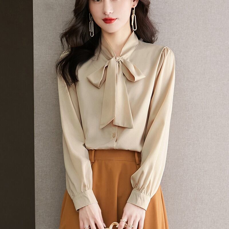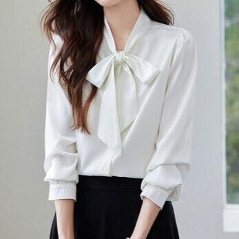 首元のリボンタイが印象的な長袖ブラウスです。シンプルな無地デザインにフェミニンなアクセントを加え、大人可愛いスタイルを演出します。