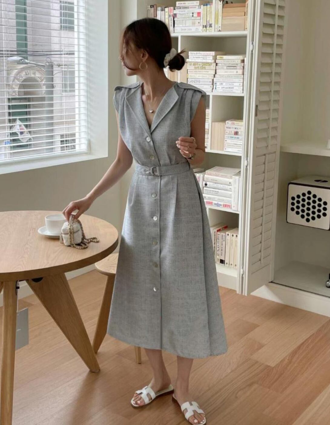 シンプルでありながら存在感を放つ、ノースリーブワンピースです。フレアスカートのミモレ丈が華やかさを演出し、襟付きデザインが上品さを引き立てます。ウエストマークのハイウエストデザインで脚長効果が期待でき、スタイルアップも。