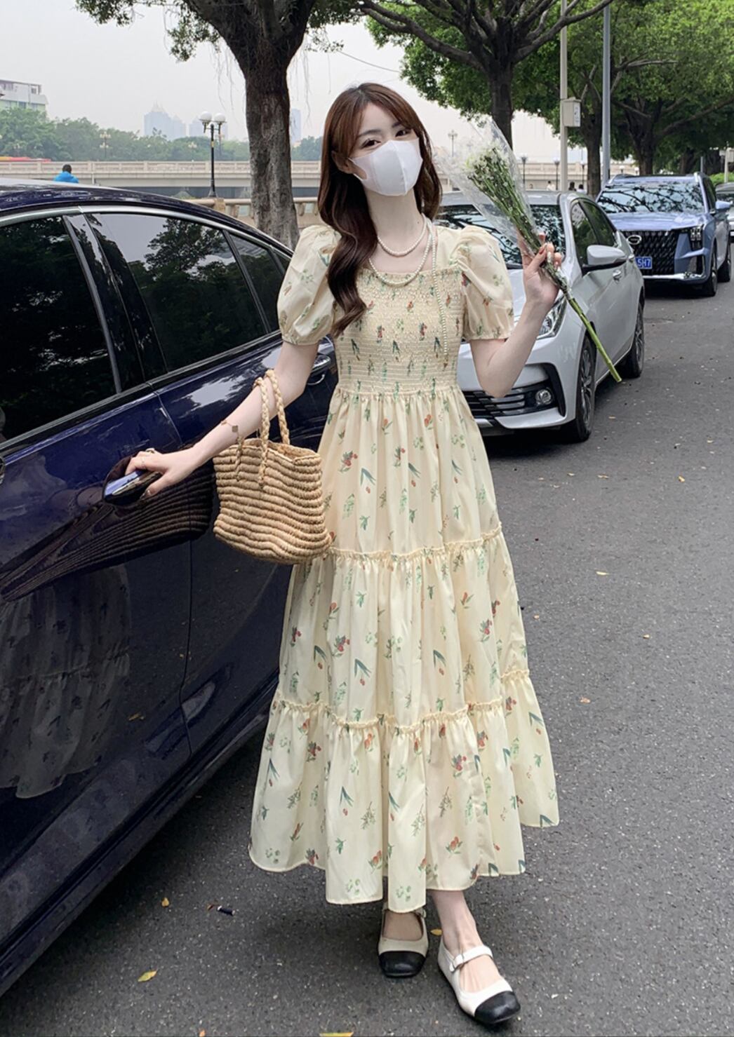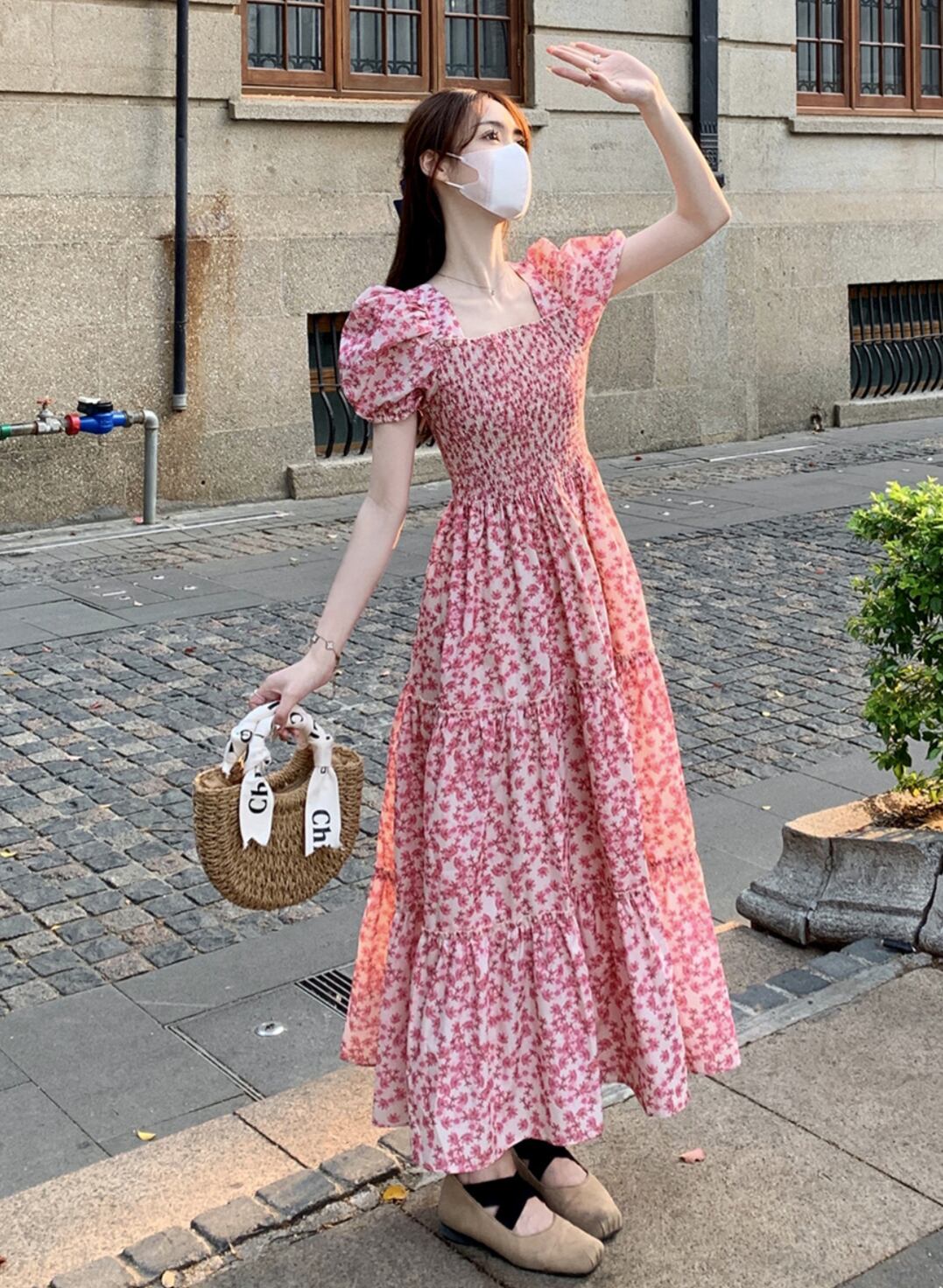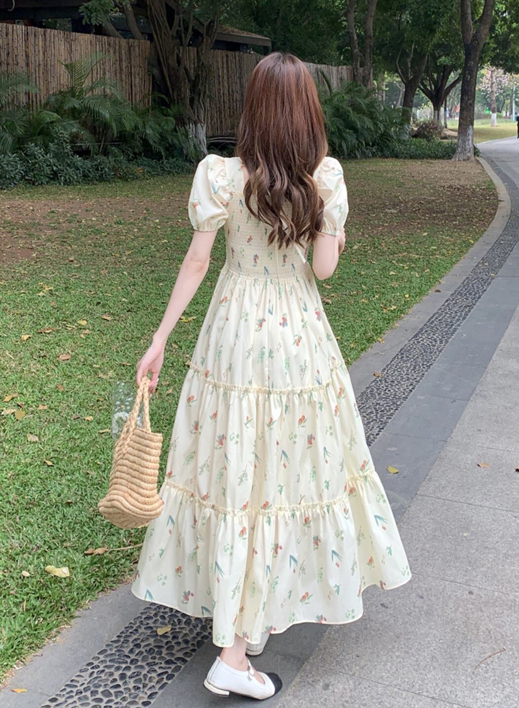 華やかな花柄が目を引くロングワンピース。ボリュームのあるパフスリーブとフレアAラインのデザインが、女性らしさを引き立てる上品でありながらも可愛らしい印象を与えます。