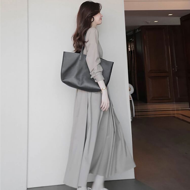 Aラインに広がるフレアシルエットとドレープが女性らしい動きを演出し、大人可愛い印象に仕上げます。