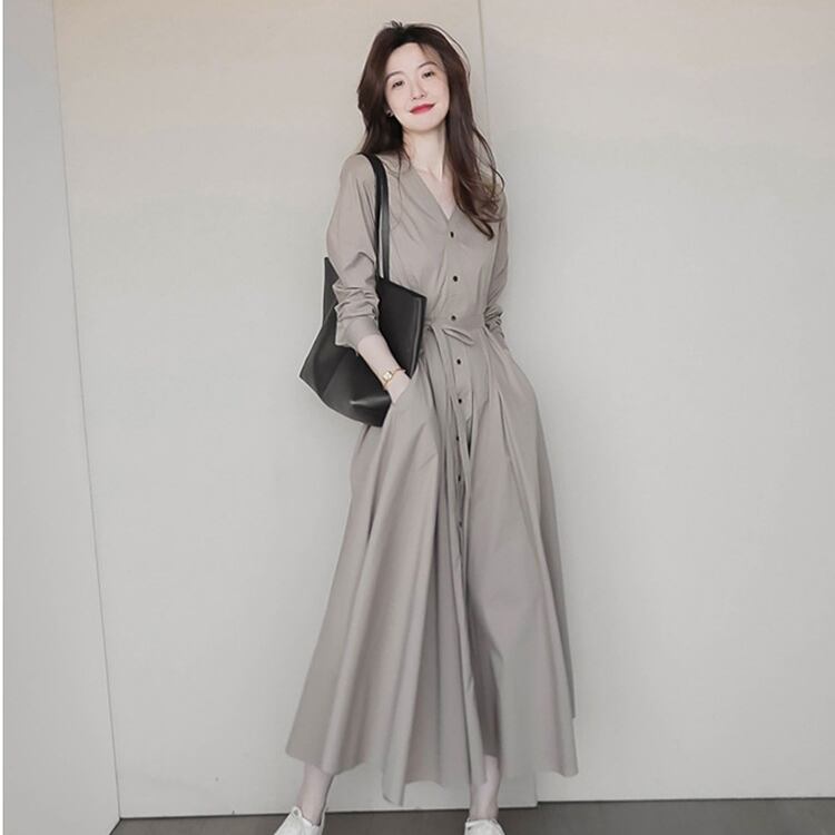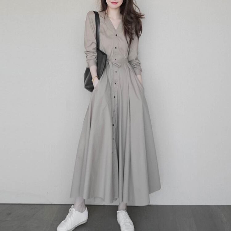 レディース ワンピース シャツワンピ フレア ロング 長袖 カフスリーブ Vネック 襟なし ノーカラー Aライン ドレープ フェミニン ウエストマーク ウエストリボン ポケット ハイウエスト コンサバ ボタン かわいい 大人可愛い きれいめ 存在感 ロマンティック 爽やか 無地 春 秋 ママ マタニティ OL デート お出かけ レストラン ショッピング コンサート コンパ 婚活 お呼ばれ オケージョン コーデ モテ 清楚 S M L XL 2XL 3XL 大きいサイズ グレー くすみ 大人カラー