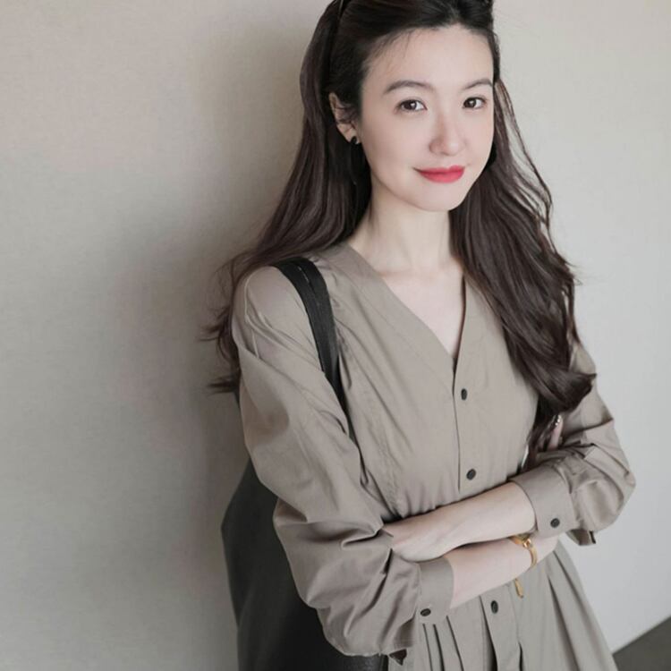 ロング丈のシャツワンピースは、ノーカラーのすっきりとしたVネックが顔まわりを上品に見せ、カフス付きの長袖がクラシカルな雰囲気を漂わせます。