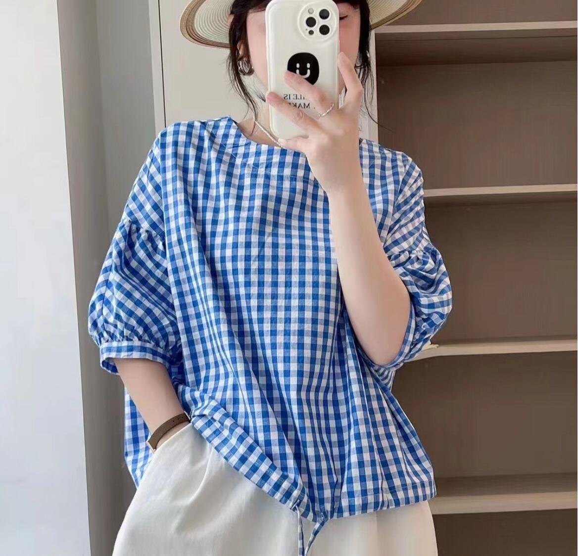 トップス シャツ ブラウス プルオーバー レディース 5分袖 パフスリーブ クルーネック フェミニン 2way 大人可愛い シンプル カジュアル おしゃれ こなれ感 ラフ ルーズ 存在感 抜け感 ナチュラル 清潔感 リラックス 爽やか 着心地抜群 ギンガムチェック 春 夏 オフィス OL 通勤 デート お出かけ イベント 女子会 休日 ショッピング カフェ ランチ 韓国 オルチャン コーデ 楽ちん 体型カバー 普段使い 着回し モテ 清楚 トレンド ゆったり フリーサイズ ワンサイズ ブルー ネイビー