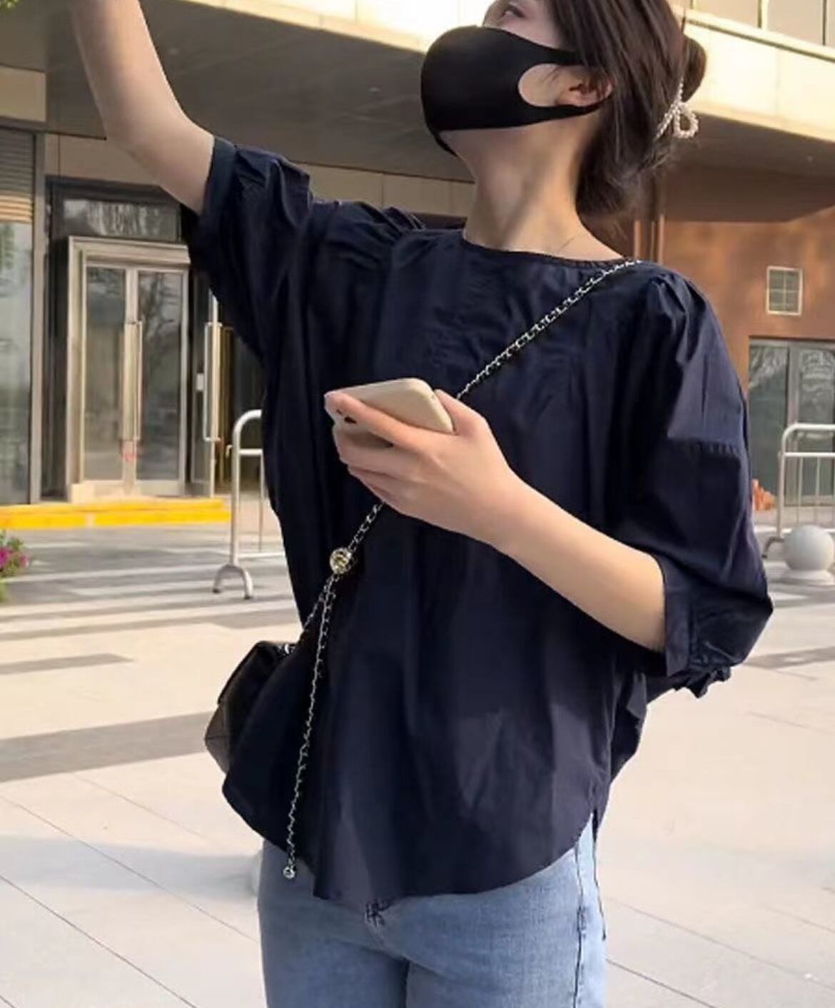 トップス シャツ ブラウス レディース 7分袖 ドルマンスリーブ パフスリーブ ラウンドネック フリル スリット ギャザー 大人可愛い カジュアル 上品 おしゃれ 個性的 抜け感 キュート アクティブ ナチュラル リラックス 爽やか 無地 春 夏 オフィス OL 通勤 デート お出かけ イベント 女子会 休日 ショッピング カフェ ランチ 韓国 オルチャン コーデ 楽ちん 体型カバー 普段使い 着回し 清楚 トレンド M L XL 2XL 3XL ゆったり ドット ライトブルー ホワイト ネイビー