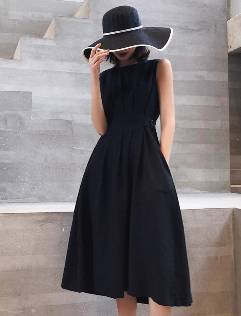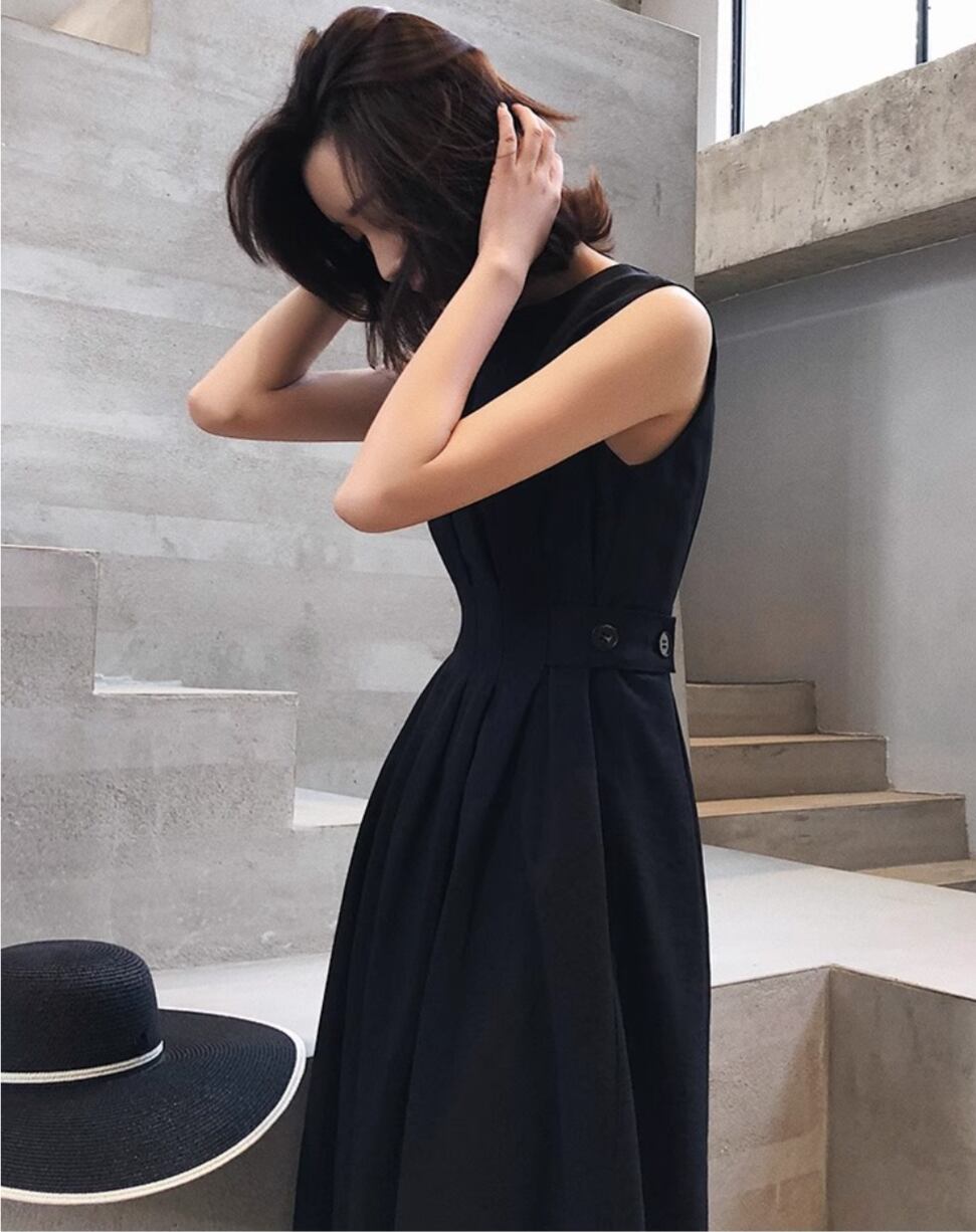 ハイネックにノースリーブ、フレアAラインのシルエットが特徴で、都会的でエレガントな印象を与えます。ウエストマークのデザインにより、スタイルアップ効果があり、美脚・脚長効果を実現します。
